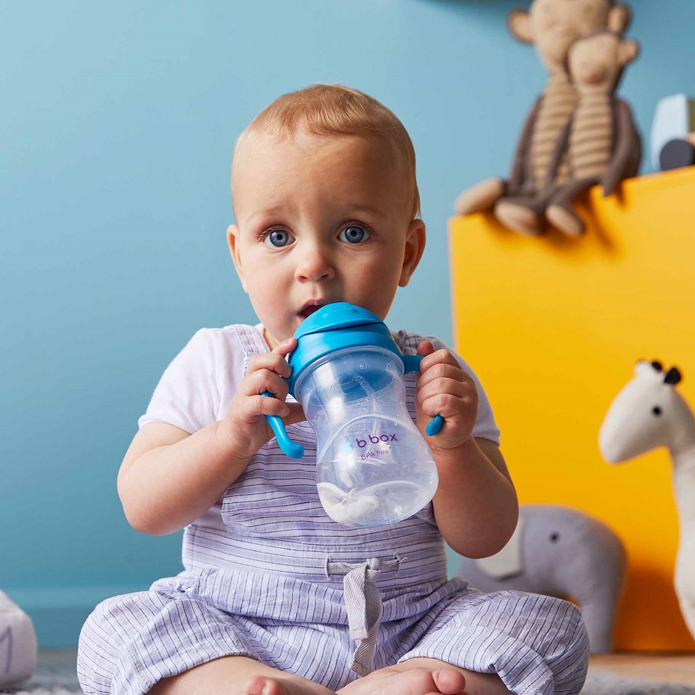 B.Box Sippy Cup Blueberry is a smart and innovative sippy cup and water bottle for children, where the straw is equipped with a patented weight and straw system that follows the liquid, which allows the child to drink from the cup in whatever angle the cup is held. Also without spilling. B.box sippy cup has a flip-top lid that folds over and protects the straw when it is not in use and grip-friendly handles. It is completely free of BPA, Phthalates and PVC and is machine washable (upper basket). B.box Sippy Cup is a perfect to use at home and alos when you are out on the town or traveling.
