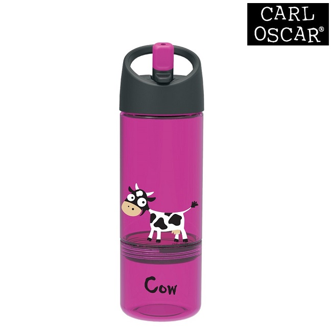 Carl Oscar Pink Cow 2-in-1 is a functional and durable water bottle for children where the lower part is a removable snack jar with space for snacks such as raisins, nuts, fruit or biscuits. The transparent bottle has a long straw that goes down to the bottom of the bottle so that the child can drink with the bottle upright and thereby avoid spillage. The smart lid has a carrying handle and a fold-out spout that closes when the bottle is not in use. The water bottle has a grip-friendly shape, holds 0.3 liters + 0.15 liters (lower part) and is free of BPA and Ftlater.