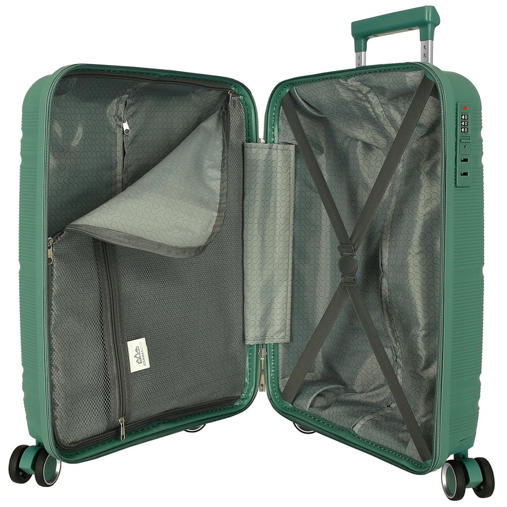 Roll Road Universe Green suitcase is a stylish and durable travel option for older children and teenagers. Made from tough molded ABS plastic, it offers impact resistance while remaining lightweight and easy to handle. Measuring 55 × 40 × 20 cm, it meets IATA’s general cabin luggage guidelines and works well as carry-on with many airlines. Four silent 360° spinner wheels ensure smooth maneuvering, while the telescopic handle with two height settings and a top carry handle provide flexible transport. The lined interior keeps packing organized, with elastic straps on one side and straps plus a zippered divider on the other. A built-in combination lock adds extra security during travel.