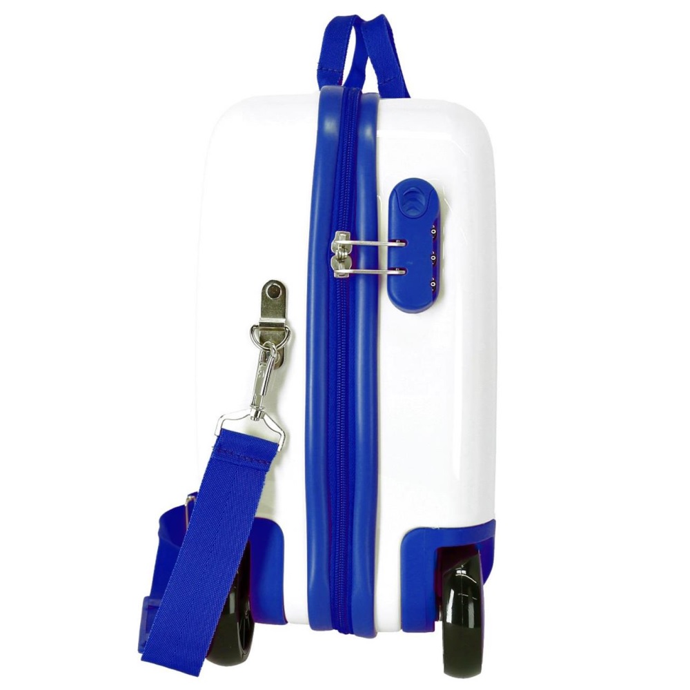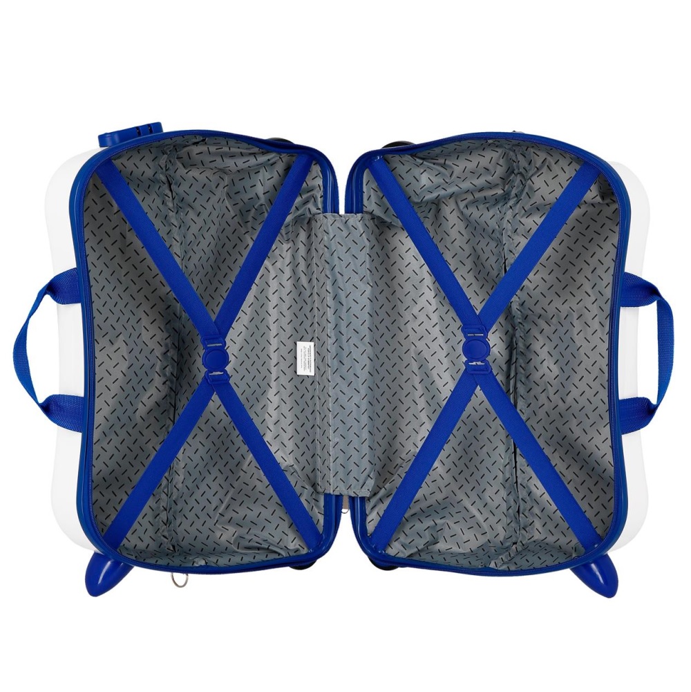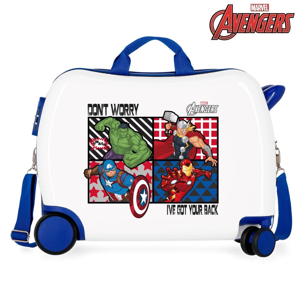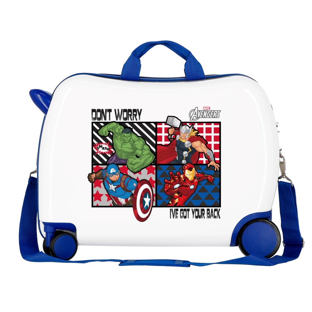 Durable, practical and fun ride on suitcase for children with a nice Avengers motif. The Avengers Don't Worry suitcase has quiet and soft wheels (front wheels turning 360 degrees), a combined drawstring and carrying strap and a code lock. The ride on suitcase works really well to sit and ride on (up to 30 kg!) and is perfect for tired legs or as a toy while waiting, for example at airports. Inside the suitcase there is plenty of space for all the children's things. The bag has different mounts so that it can both be pulled (the child rides) and carried by the parent and slightly older children as a shoulder bag. As the size of the suitcase fits within the IATA regulation of handlugage, the suitcase can be taken on board the aircraft (however, check what rules apply to your airline).