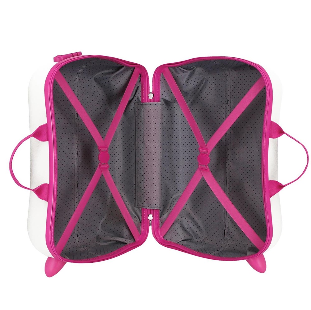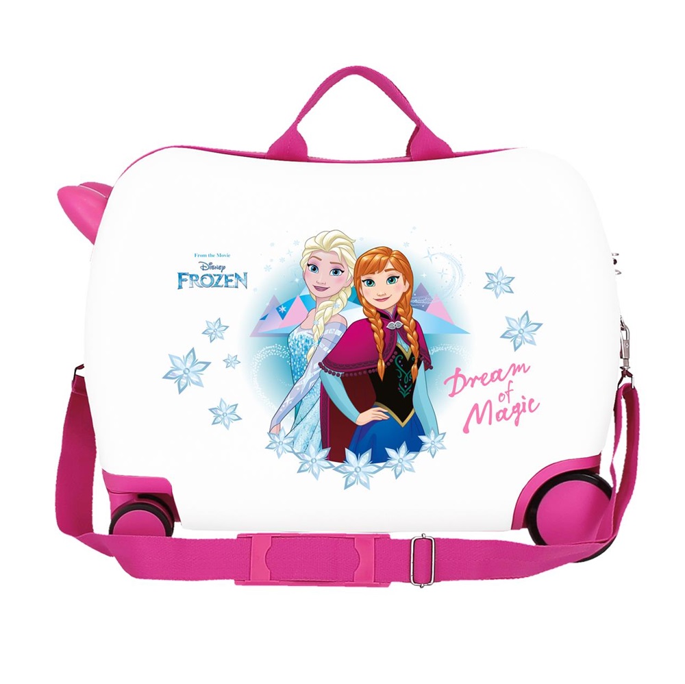 Practical, durable and fun ride on suitcase for children with a nice Elsa & Anna motif. The Frozen Sparkle Like Magic suitcase has quiet and soft wheels (front wheels turning 360 degrees), a combined drawstring and carrying strap and a code lock. The ride on suitcase works really well to sit and ride on (up to 30 kg!) and is perfect for tired legs or as a toy while waiting, for example at airports. Inside the suitcase there is plenty of space for all the children's things. The bag has different mounts so that it can both be pulled (the child rides) and carried by the parent and slightly older children as a shoulder bag. As the size of the suitcase fits within the IATA regulation of handlugage, the suitcase can be taken on board the aircraft (however, check what rules apply to your airline).