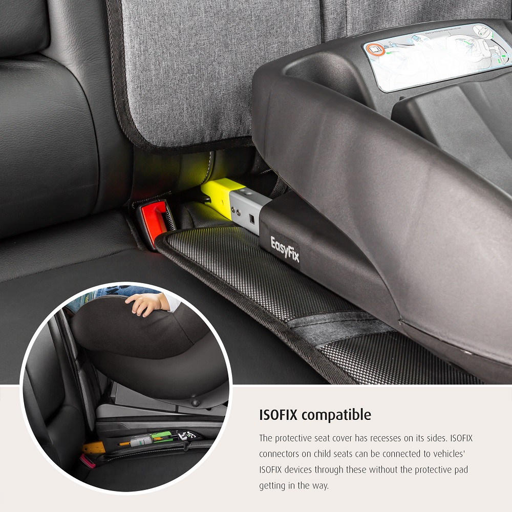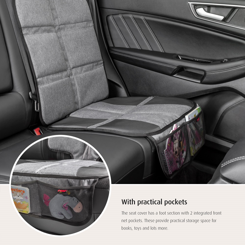 Reer TravelKid Protect Maxi is a universal car seat protector which idurable and has a padded cover, which protects the rear seat from dirt, scratches and pressure marks from the car seat. The seat cover is Isofix-compatible (with space for a seat belt) and has anti-slip on both sides so that both the car seat and the seat protector are firmly in place. On the front, the Reer TravelKid Protect has two practical mesh pockets for storing of small items. The cover is made of water and dirt-repellent material and is easy to clean.