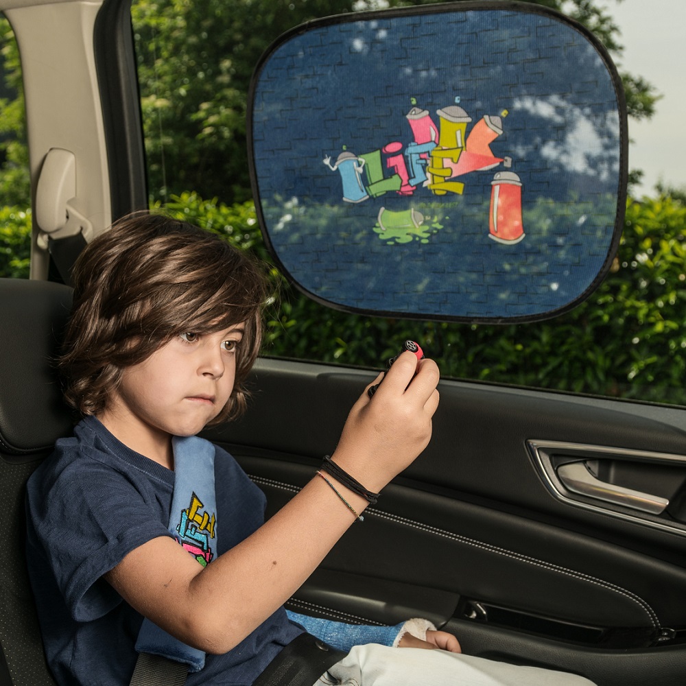 Walser Car Sun Shade Graffiti is a functional and practical sun protection for the the car's rear side windows. The sun shade is self-attaching (no suction cups needed), which makes is very easy to set up and take down. Delivered in 2-pack.