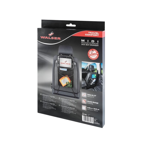 Walser Midi is a practical car backseat organizer with a smart holder for iPad and tablet (up to 10 inches screen). The seat cover has two pockets for gadgets. The seat cover is easy to install and also protects the back of the front seat from dirt, scratches and wear.