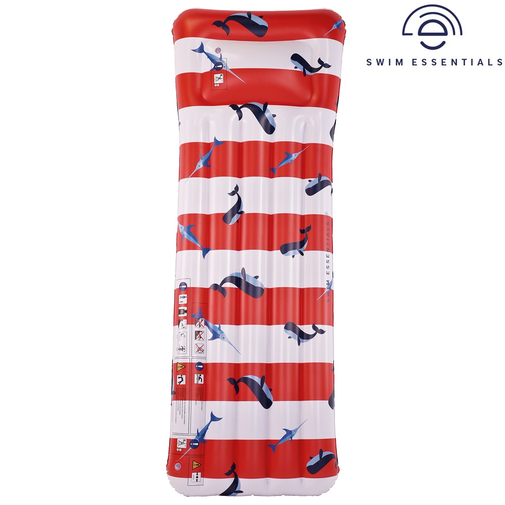 Swim Essentials Whales is an inflatable water mattress in a nice size (177 x 67 x 16 cm) with an integrated pillow. The water mattress, which is safety tested according to EU standards, is made of strong and durable non-toxic PVC (0.2 mm thick) and has two separate air chambers with safety valves. Swim Essentials water mattress has a capacity of up to 80 kg and is intended for children 6 years +. Bring the mattress on a sun holiday or use it at home by the pool or in the sea.