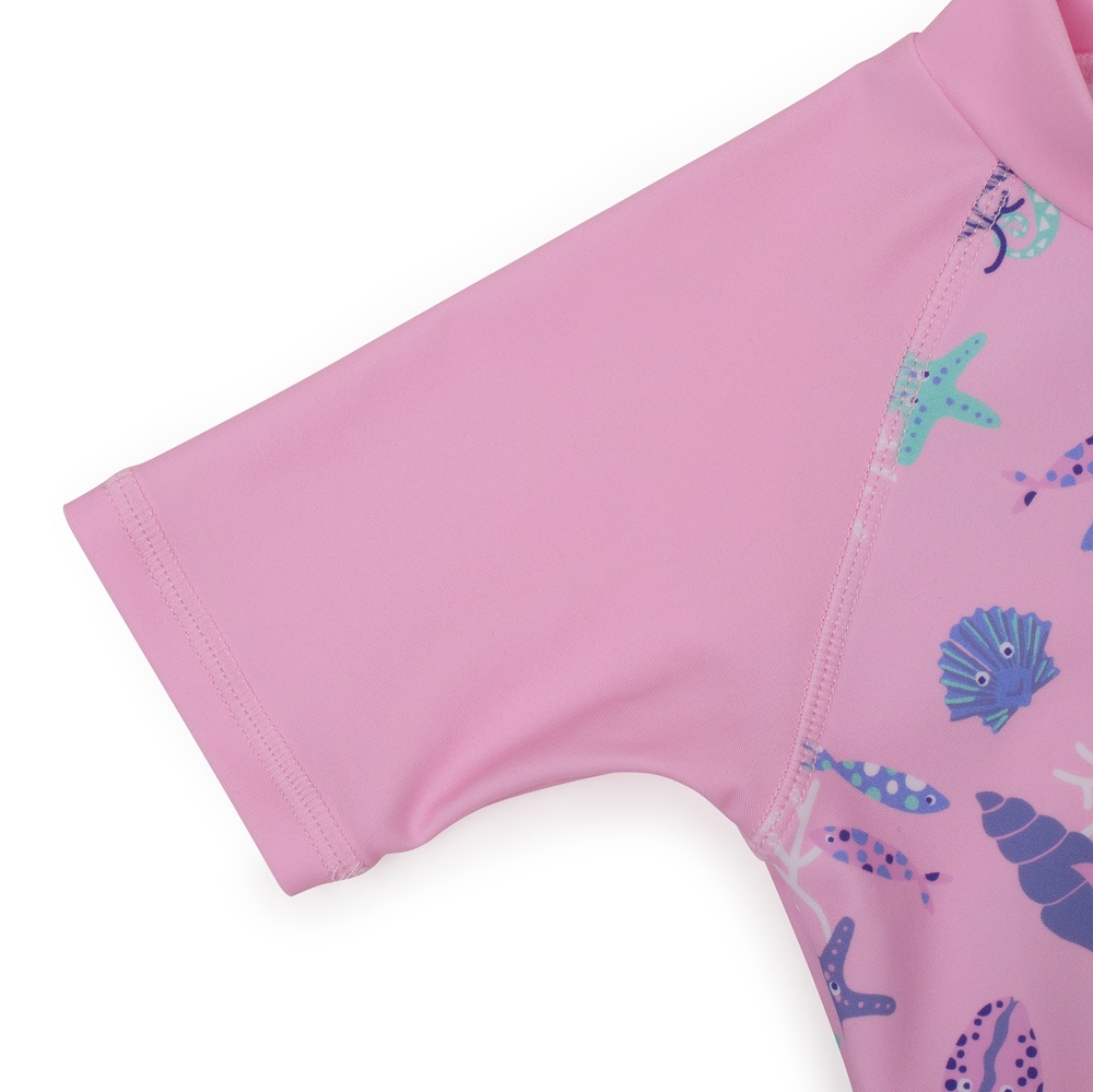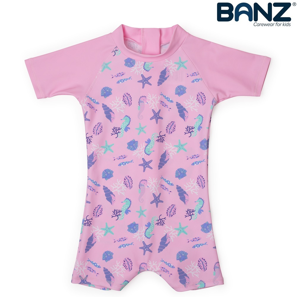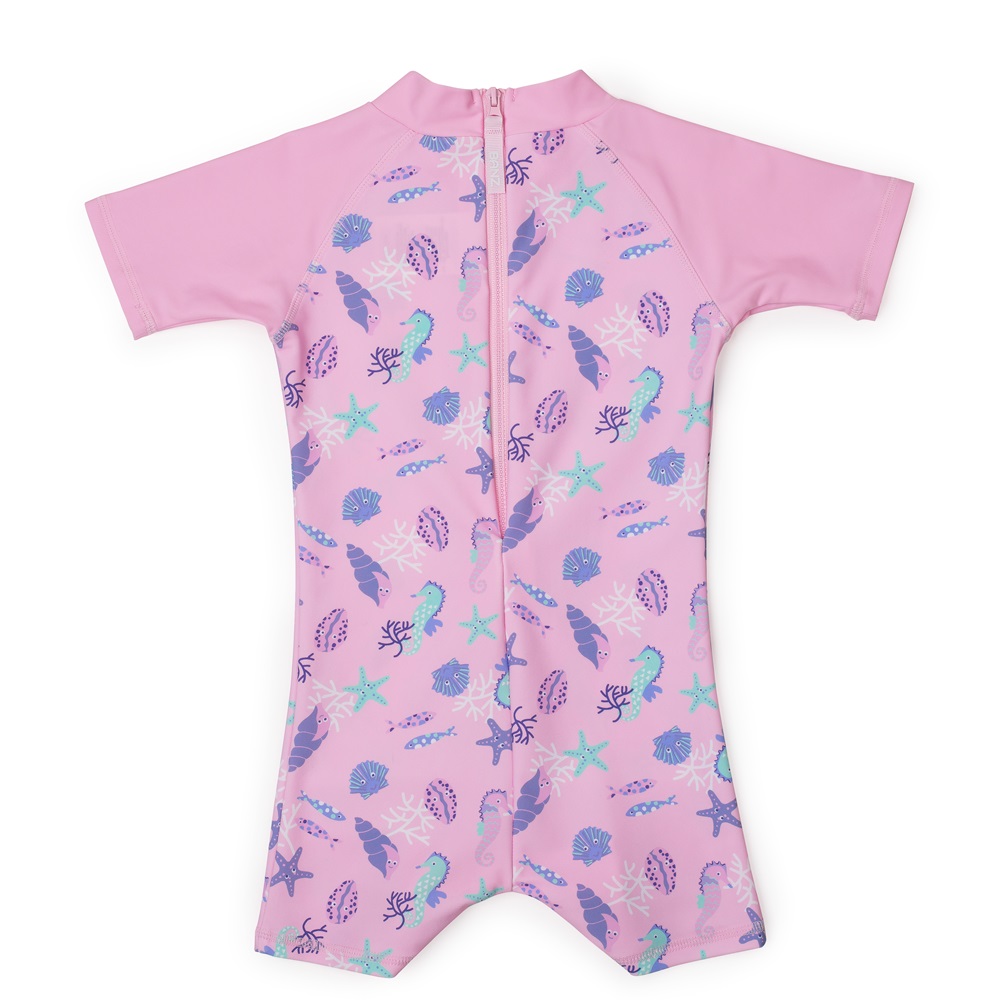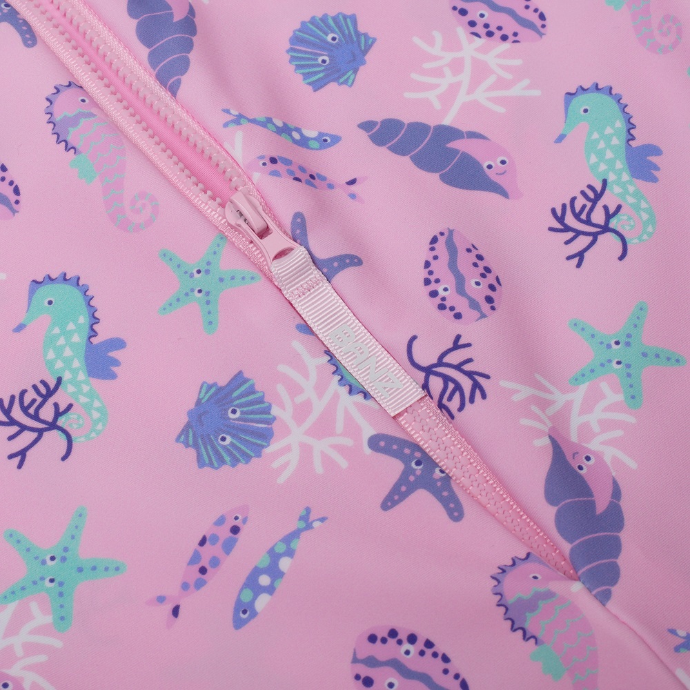 Banz Sealife is a well-made and protective UV suit with 3/4 sleeves for children and babies made in a cute design. The UV suit has certified UV protection SPF 50+ and protects the child against the sun's dangerous UV rays. Banz Sealife is made of soft and flexible material that dries quickly. On the back of the UV suit there is a sewn-in zipper (which does not rub against the child's back) which makes it easy to put on and take off the suit and for nappy changes. The soft material is durable and chlorine and bleach resistant. Banz UV suit is machine washable.