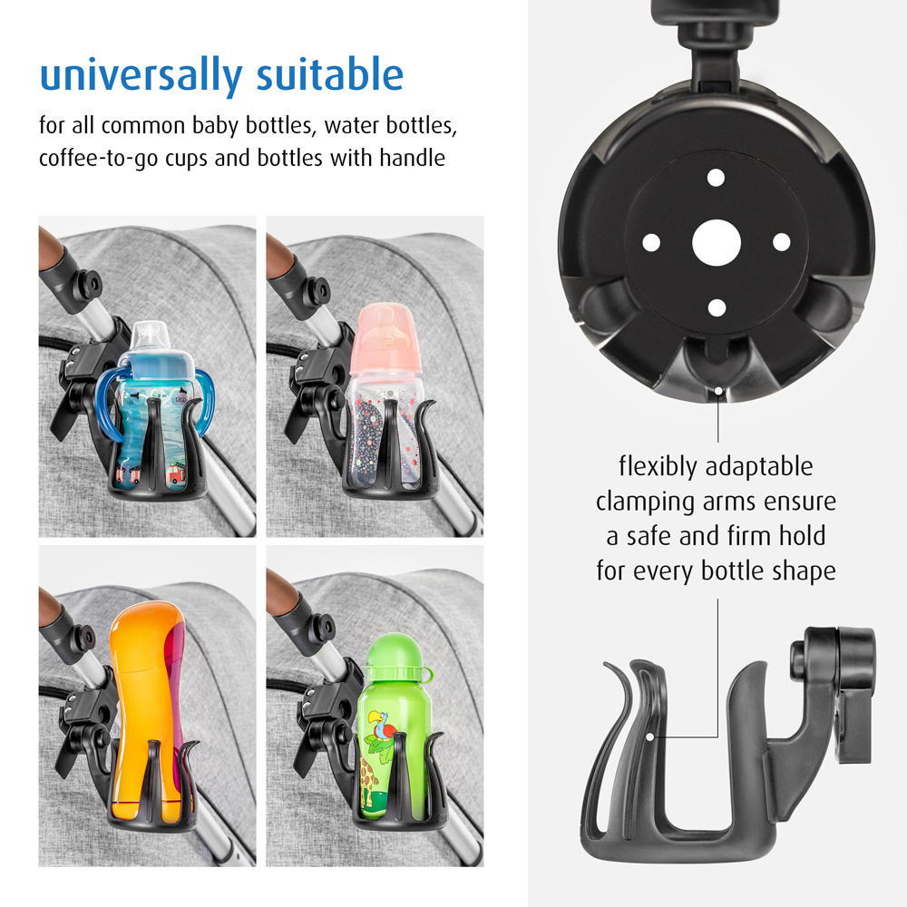 Reer Clipp&Go Cup Holder is a smart and practical cup and bottle holder for the pram. Thanks to the product's smart mount, the holder can be used on all common stroller types (buggies, strollers, pushchairs, joggers, etc.), but it also works great to attach and use on the bike (can be attached to a tube shape up to 50 mm in diameter). The bracket can be adjusted at a 180 degree angle to fit your pram or bike. The holder itself fits most types of bottles, mugs, coffee cups that have a diameter at the bottom of 5-7 cm (normal standard).