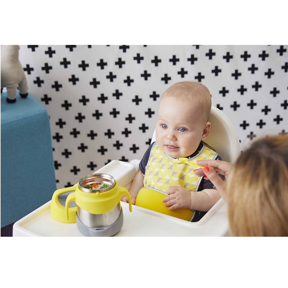 B.box Insulated Food Jar Lemon Sherbet is a practical and warm-keeping food thermos with double walls made of food-approved stainless steel that keeps the food warm for 5 hours or cold for up to 7 hours. Fill the food thermos with hot food, such as pasta and soup, or with cold food such as fruit and yoghurt and feed your child when it gets hungry, for example at airports, on buses, at the restaurant or when you are with relatives and friends. You do not have to look for pots, microwaves and stoves to heat your child's food.