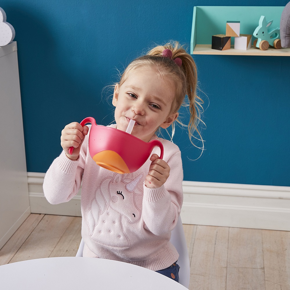 Award-winning multifunctional food bowl with straw for kids. B.box Bowl and Straw XL Strawberry Shake is an innovative product that can be used as a regular bowl for feeding with a spoon or fork, and with the included straw (which is attached to the edge of the bowl), the child can also drink from the bowl (e.g. milk or soup). B.box Bowl and Straw XL has grip-friendly and sturdy handles, anti-slip at the bottom and a tight-fitting lid.