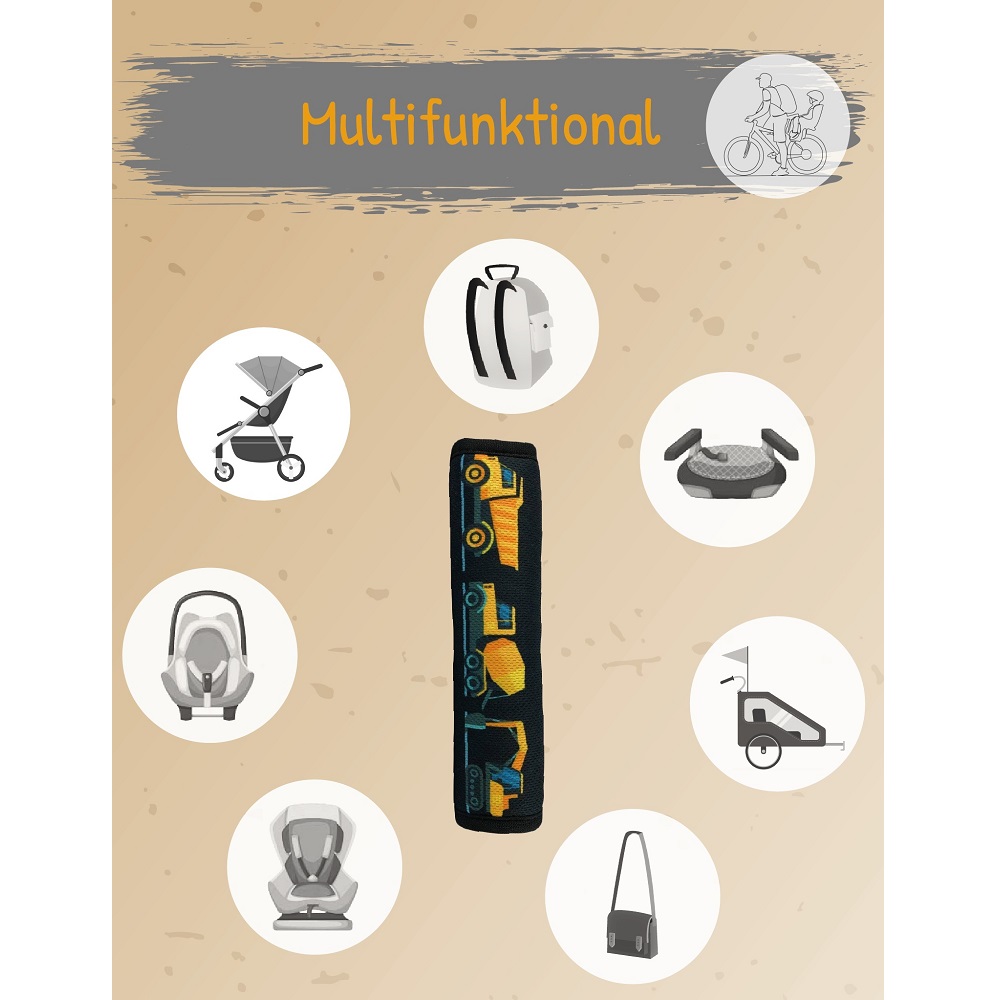 To ease the pressure on the child's chest, a soft and cozy belt cover can come in handy on car holidays. Heckbo Building Machines is a universal seat bek´lt cover that fits all common types of sea belts. The seat belt cover is 21 cm (length) x 6 cm (width) and fastens with velcro around the seat belt.