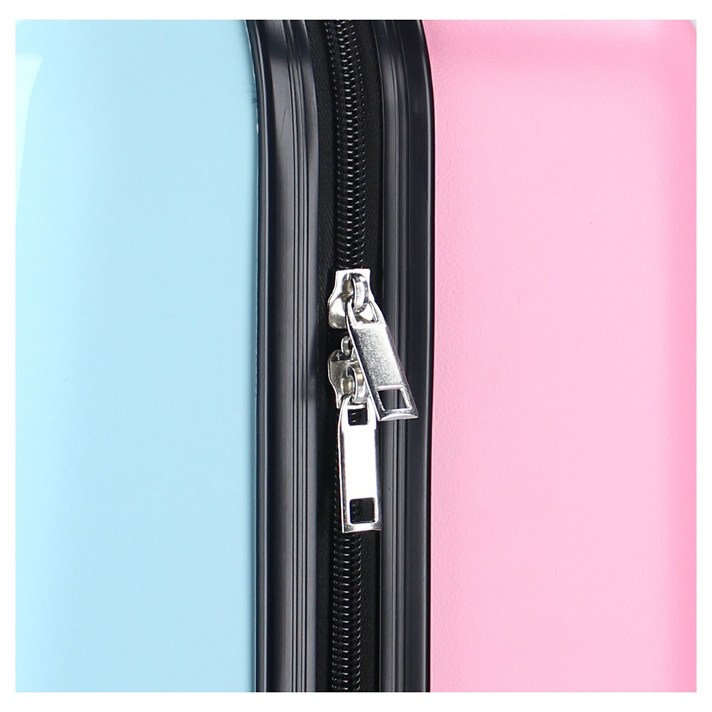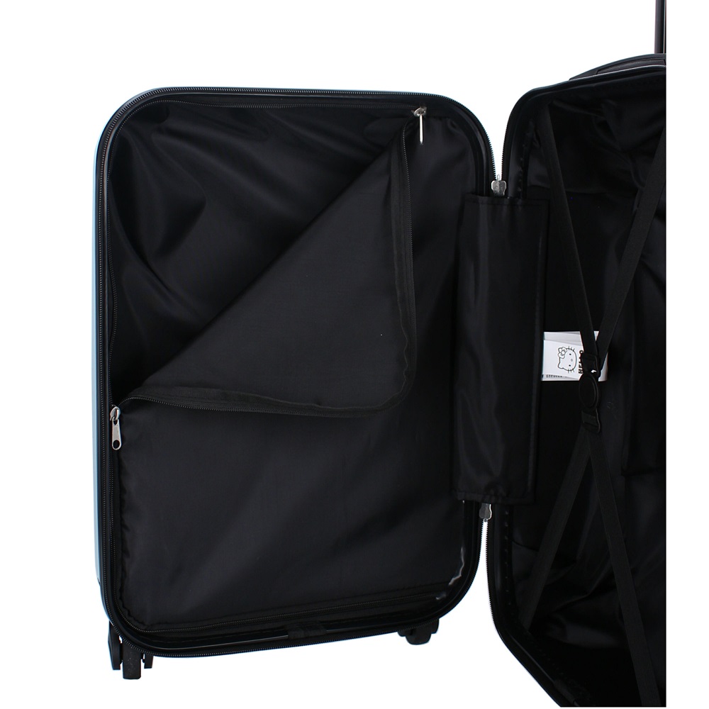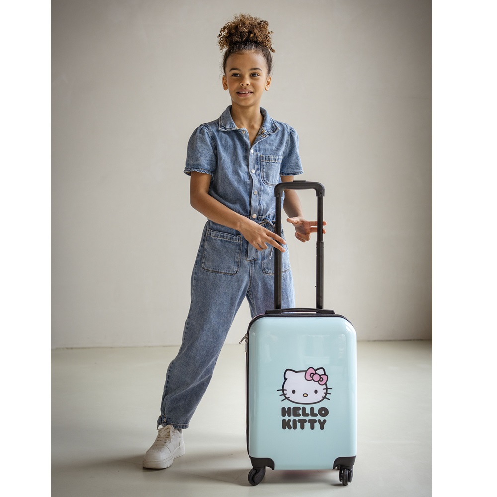 The Hello Kitty Voyage Vibes suitcase is a cute and functional suitcase for children made of stable and durable ABS molded plastic (see below). The suitcase, which is 53 x 35 x 23 cm, has a total packing space of 31.8 liters divided into two compartments. One compartment has straps while the other side has a cover that closes with a zipper. Hello Kitty Voyage Vibes has a telescopic handle, a carrying handle and four quiet wheels that spin 360 degrees for smooth driving, for example at airports.