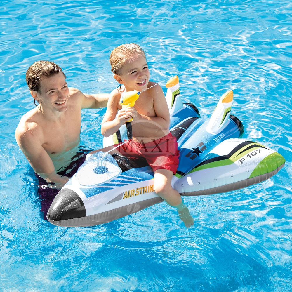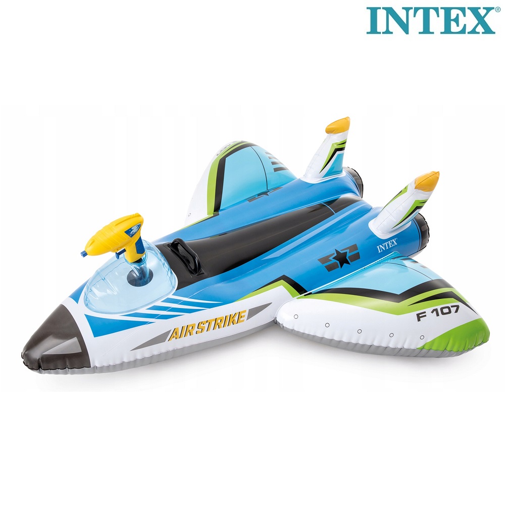 The Intex Water Gun Plane Ride On Blue is an inflatable pool float in the shape of an aircraft made in a tough and stable design. The aircraft is well-sized in size (117 x 117 cm) and equipped with a water pistol. Next to the holder for the water gun is a handle to hold on to. The aircraft is made of strong vinyl that is resistant to both sun and salt water. Intended for children from about 3 years.