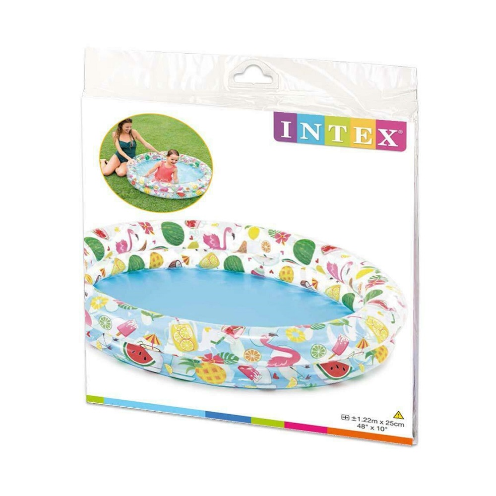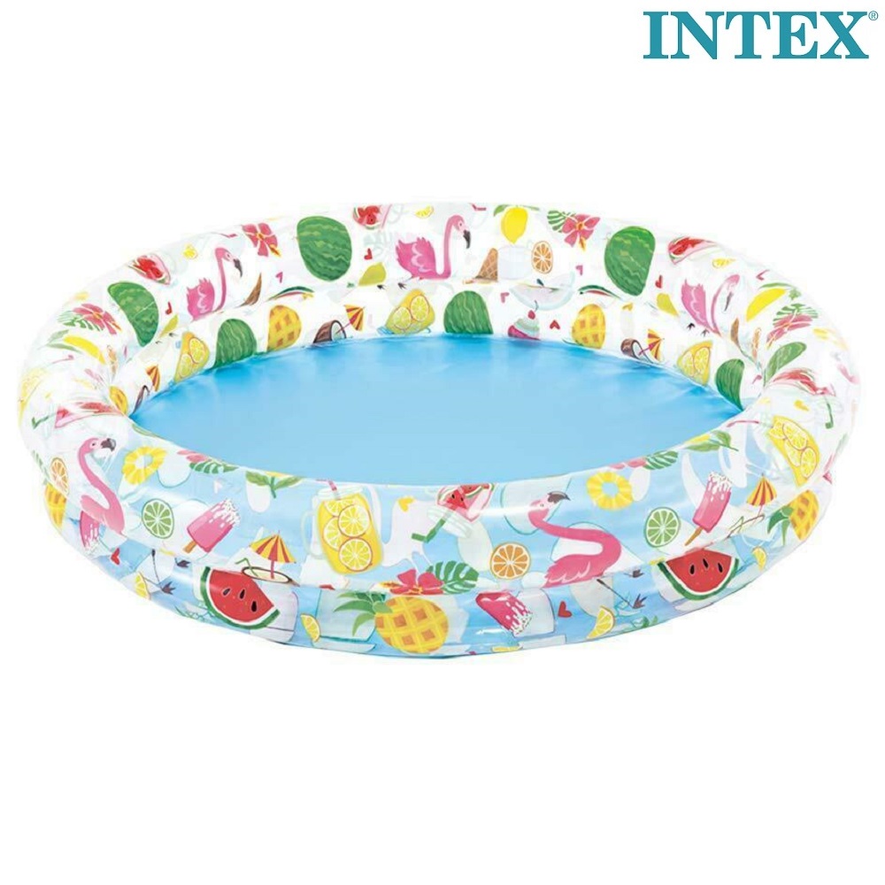 Lovely children's inflatable pool for bathing during hot and sunny days in the garden, on the beach or on a holiday trip. Intex inflatable pool Fruit has three separate air chambers with safety valves and is 122 cm in diameter. When the air is taken out and the pool is folded, it becomes so small that it can even be included in the suitcase for the sun holiday.