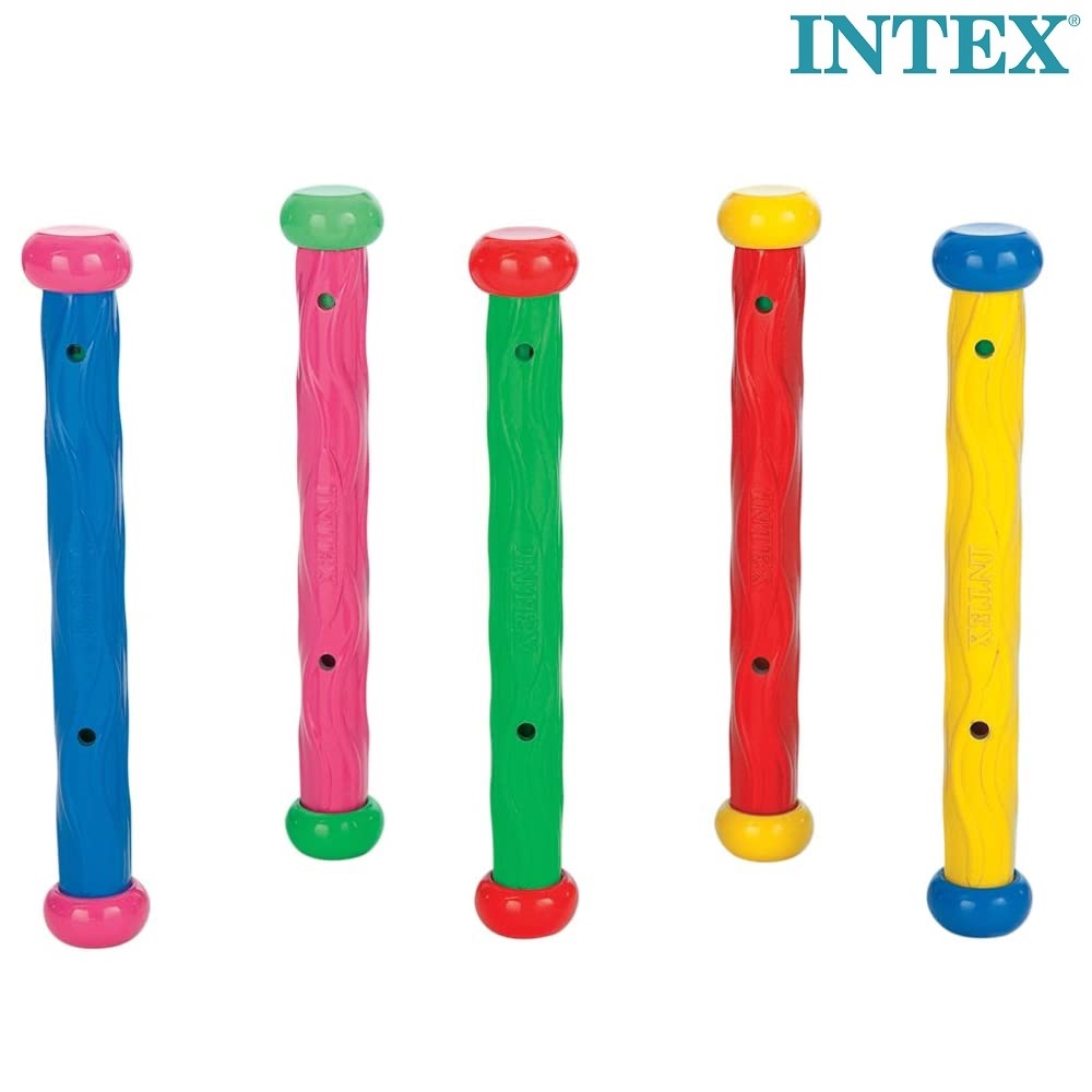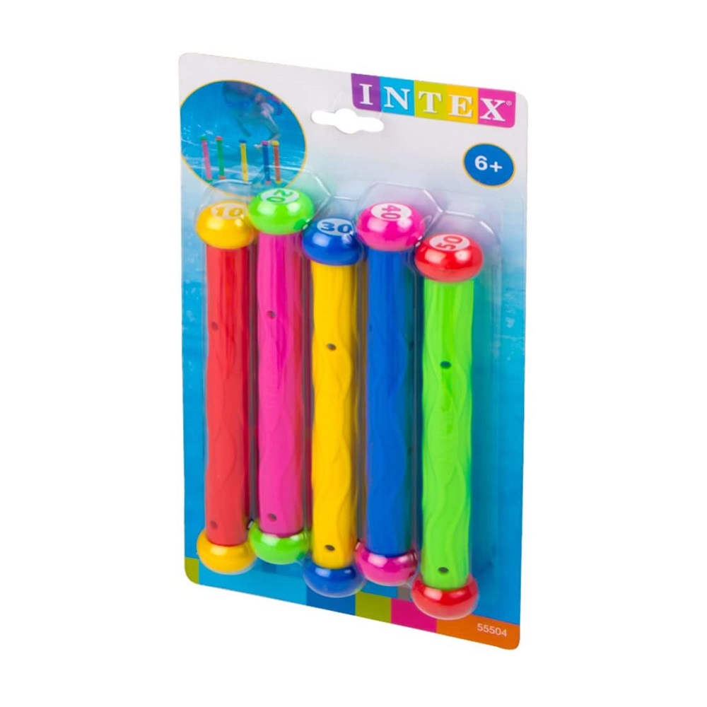 Intex Dive Sticks 5-pack is a set of 5 different diving sticks for children. The diving sticks are intended for use in swimming pools. When the sticks are thrown into the pool, they sink. At the bottom, the diving sticks stand vertical so that the children can find them and pick them up. Intex Dive Sticks are 20 cm long and made of soft grip-friendly rubber.