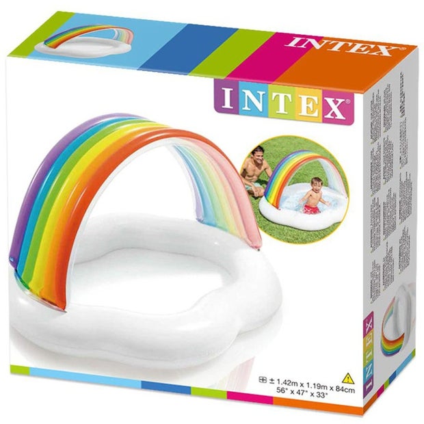 Inflatable children's splash pool with sun protection for children. Intex Cloud and Rainbow is 142 x 119 cm at the bottom and has a sun protection of 84 cm in height. Packed up, the pool is small and light and fits in a suitcase. Perfect to splash in on the trip or to use on the terrace when it's sunny and warm.