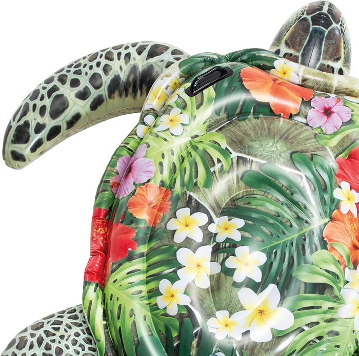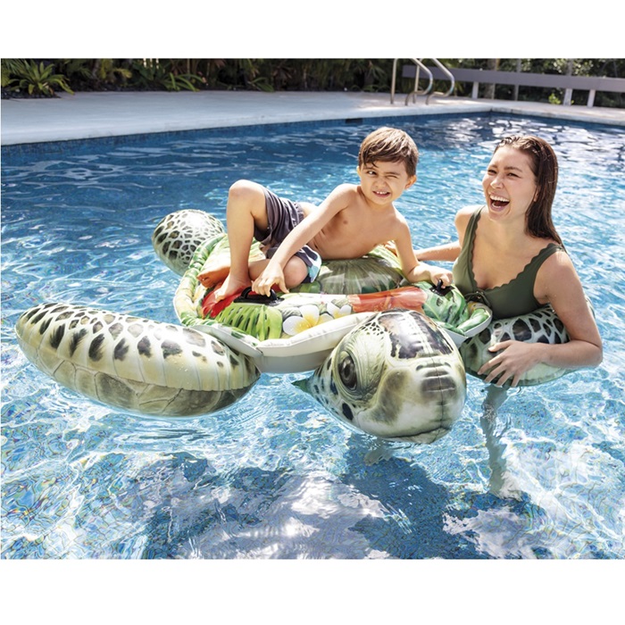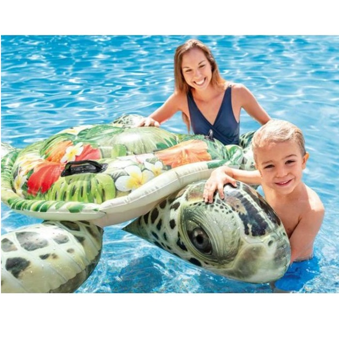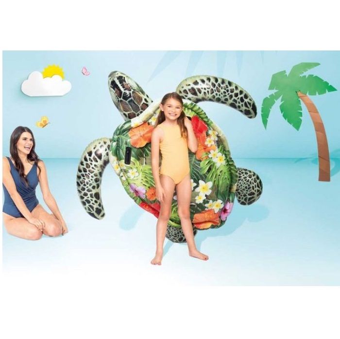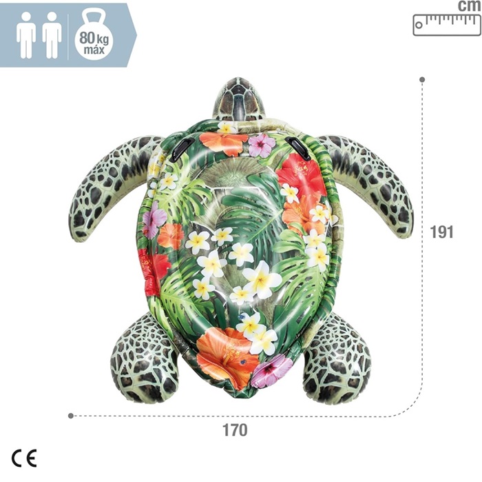 Intex Sea Turtle XXL is a large and inflatable pool float for play in the pool and sea. The turtle is large (191 cm x 170 cm) and is equipped with practical handles for the child to hold on to. Intex inflatable pool floats are made of durable and non-toxic vinyl and are safety tested according to EU standards.