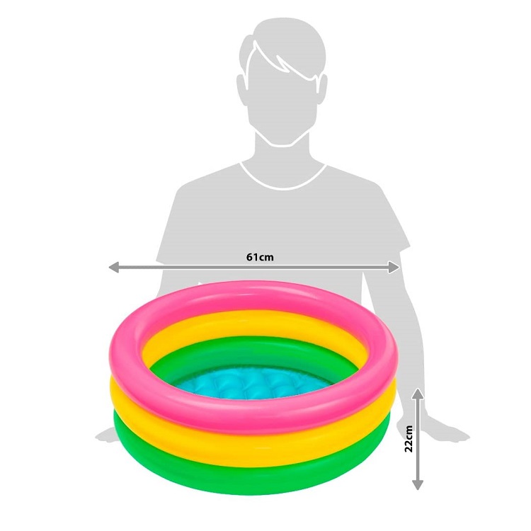 Intex rainbow is a small inflatable children's pool (splash pool) for the very youngest children. The pool is 61 cm in diameter and the height of the pool edge is 22 cm. Packed together, the pool is small and light and fits in your suitcase. Perfect to splash in on the holiday trip or to use on the terrace when it is sunny and warm at home.
