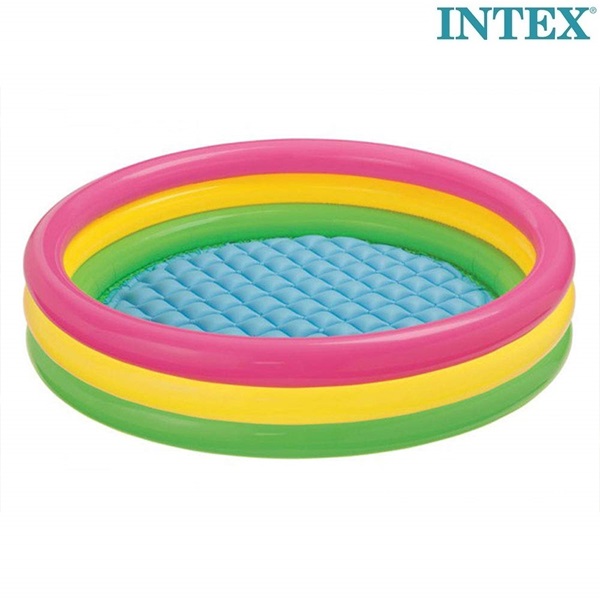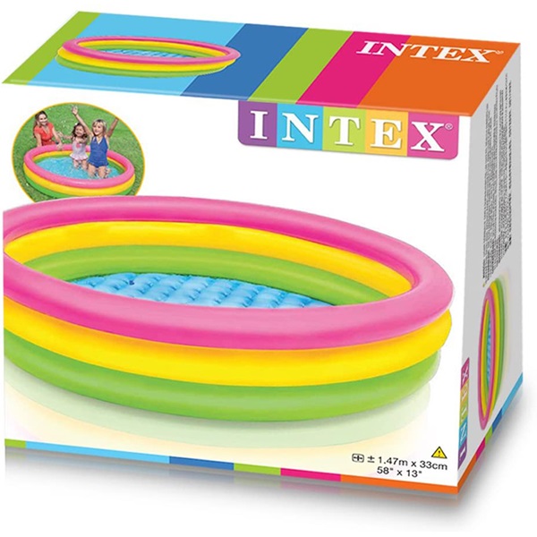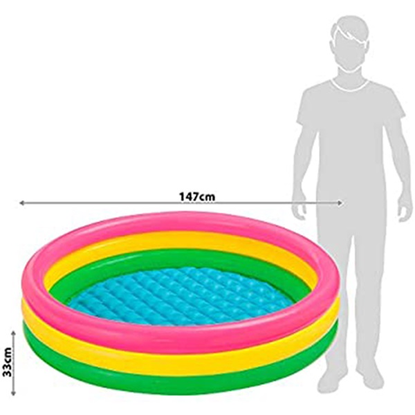 Intex Sunset Glow is a lovely inflatable children's pool with space for water fun. The children's pool is 147 cm in diameter and has two separate air chambers with safety valves, is safety tested and made of durable vinyl.