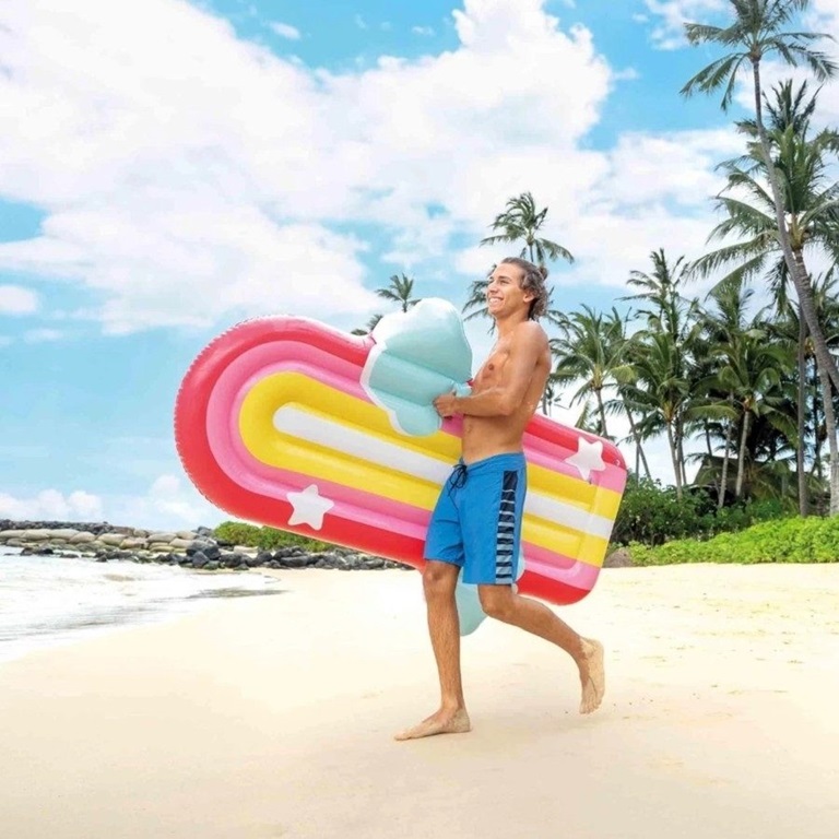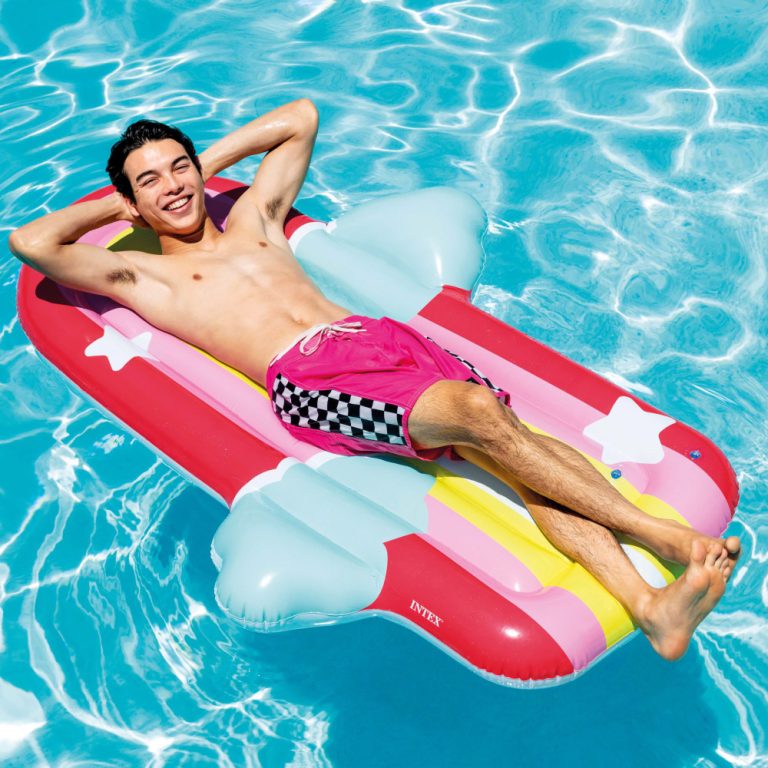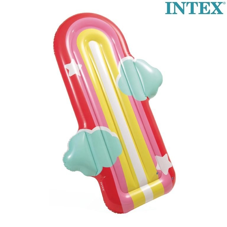 Intex Rainbow and Clouds is an inflatable and stable water mattress. The water mattress is 175 x 117 x 22 cm and made of durable vinyl and has air chambers with safety valves. Intex Rainbow and Clouds has a capacity of up to 100 kg and is intended for children 6 years+. Take the mattress with you on holiday in the sun or use it at home in the pool or in the sea.
