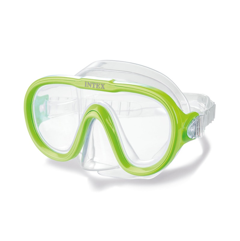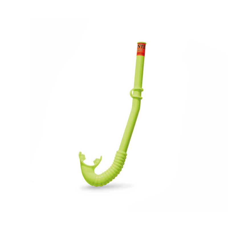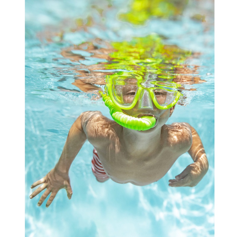 Functional and fun snorkel set for kids that includes kid-sized mask and a snorkel. Intex Adventurer Green is intended for children from around 8 years of age and is perfect for wet days both in the pool and the sea. Both the mask and the snorkel are made in size to fit a child's face and mouth. The mask is made of anti-allergic material in latex-free PU plastic. The snorkel has a thermoplastic mouthpiece, contour shape, and protection against water splashes. The snorkel can be attached to the mask.