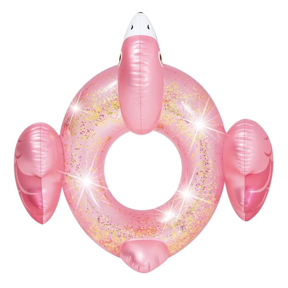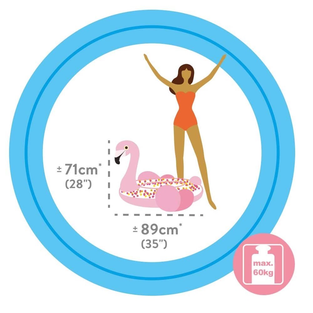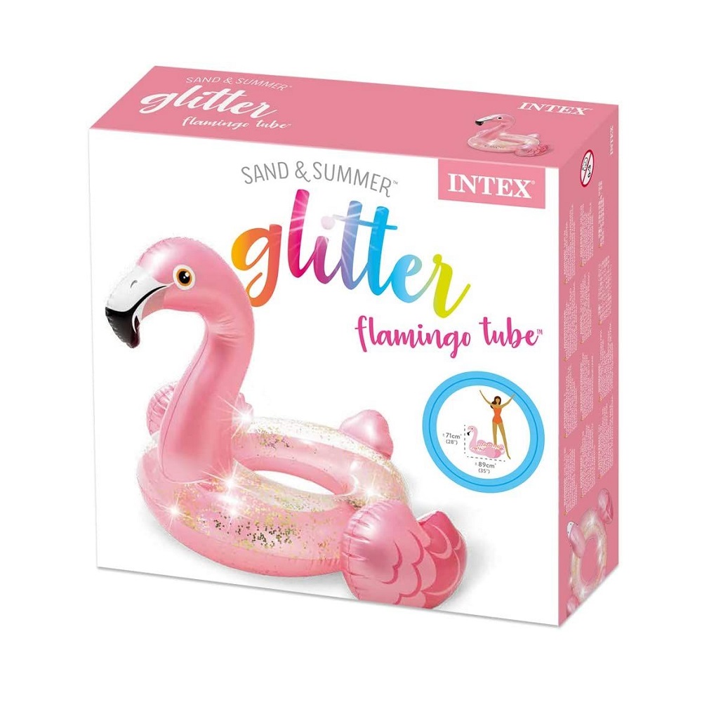 Intex Glitter Flamingo is a nice and inflatable swim ring and pool float for children for happy play and swimming in the sea and the pool. The Flamingo swim ring, which is 89 cm in diameter, is made of durable vinyl and has a safety valve. Intex Glitter Flamingo is safety tested and intended for children 6 years + (max weight 60 kg).