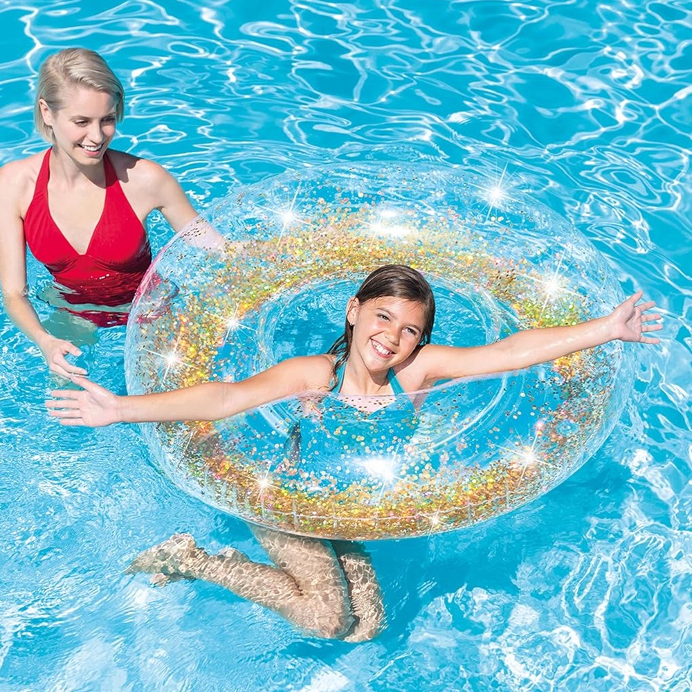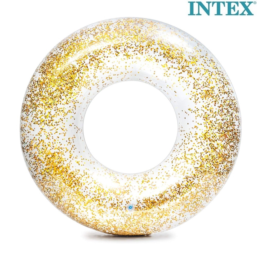 Intex Glitter Gold is a cool and large inflatable swim ring in XL format (119 cm) for fun days in the sea and pool. The swim ring is made of heavily tested vinyl, has a safety valve, is CE-marked and intended for slightly older children. Take the swim ring with you on the trip or use it on the beach or in the pool at home.