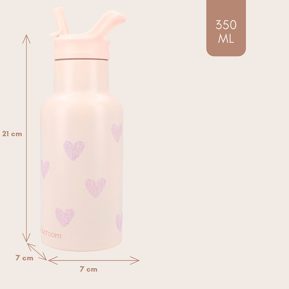 Kidzroom Hearts is a cute, practical and durable metal drinking bottle for children. The drinking bottle is made of food-grade stainless steel and holds 350 ml. A metal drinking bottle keeps the drink cool and tasty for longer, and is also easy to care for and durable. Kidzroom Hearts has a drinking spout that can be folded down, thus protecting it from dirt, when the child has finished drinking. It also has a practical carrying handle. Inside the bottle is a straw that reaches all the way to the bottom of the bottle, so that the child can drink with the bottle in an upright position and thus avoid spills. Take the drinking bottle to school, on an excursion, training or on a car trip.