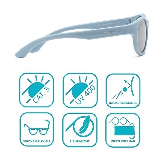 Koolsun Boston Dream Blue sunglasses for children have a classic look with a modern touch. The design is such that it fits both girls and boys. The frame and temples on the glasses are made of high quality TPE plastic, which makes them very flexible and almost unbreakable, even if someone accidentally sits on them. The sunglasses have unbreakable polycarbonate lenses, certified UV-400 protection (CE category 3) and filter 100% UVA and UVB radiation. The sunglasses are ideal for children to wear both at home both in summer and winter and on the sun holidays in warm countries. The UV filter is inside the lenses and not coated on top, so your child's eyes are always protected from UV light even if the sunglasses are scratched. The sunglasses are delivered with a practical storage bag in microfiber.