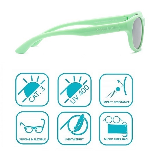 Koolsun Boston Green Ash sunglasses for children have a classic look with a modern touch. The design is such that it fits both girls and boys. The frame and temples on the glasses are made of high quality TPE plastic, which makes them very flexible and almost unbreakable, even if someone accidentally sits on them. The sunglasses have unbreakable polycarbonate lenses, certified UV-400 protection (CE category 3) and filter 100% UVA and UVB radiation. The sunglasses are ideal for children to wear both at home both in summer and winter and on the sun holidays in warm countries. The UV filter is inside the lenses and not coated on top, so your child's eyes are always protected from UV light even if the sunglasses are scratched. The sunglasses are delivered with a practical storage bag in microfiber.