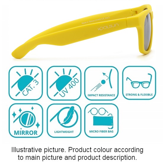 Tough and protective sunglasses for kids in a stylish design and with a good fit. Koolsun Wave Empire Yellow sunglasses have a durable frame and temples in flexible material. The lenses in Revo technology are made of strong and durable polycarbonate which provides 100% UV protection (UV-A and UV-B) and high resistance to scratches. All Koolsun glasses come with a storage bag made of microfiber.