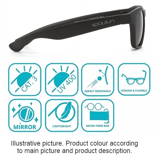 Tough and protective sunglasses for kids in a stylish design and with a good fit. Koolsun Wave Matte Black sunglasses have a durable frame and temples in flexible material. The lenses in Revo technology are made of strong and durable polycarbonate which provides 100% UV protection (UV-A and UV-B) and high resistance to scratches. All Koolsun glasses come with a storage bag made of microfiber.