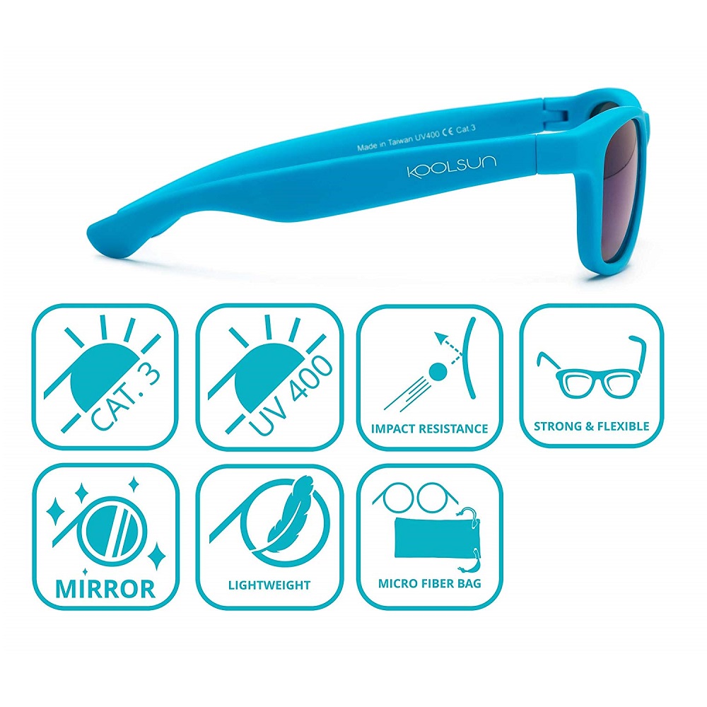 Tough and protective sunglasses for kids in a stylish design and with a good fit. Koolsun Wave Neon Blue sunglasses have a durable frame and temples in flexible material. The lenses in Revo technology are made of strong and durable polycarbonate which provides 100% UV protection (UV-A and UV-B) and high resistance to scratches. All Koolsun glasses come with a storage bag made of microfiber.