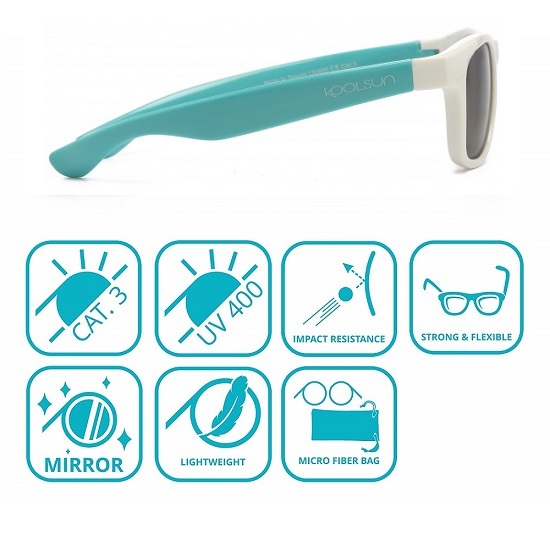Tough and protective sunglasses for kids in a stylish design and with a good fit. Koolsun Wave White Aquarius sunglasses have a durable frame and temples in flexible material. The lenses in Revo technology are made of strong and durable polycarbonate which provides 100% UV protection (UV-A and UV-B) and high resistance to scratches. All Koolsun glasses come with a storage bag made of microfiber.