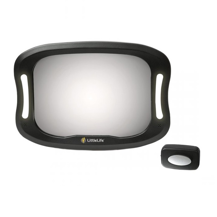 LittleLife Baby Car Light-Up Mirror is a smart car baby backseat mirror with built-in LED light (with remote control) for full supervision of your child in the rear seat both during the day and when it is dark in the car. The LittleLife mirror has a large convex mirror that can be easily adjusted at the right angle to the child. The mirror is easily attached to the rear seat headrest and is adjustable both up and down and sideways. The mirror is made of unbreakable material and is intended to be used for rear-facing car seats.