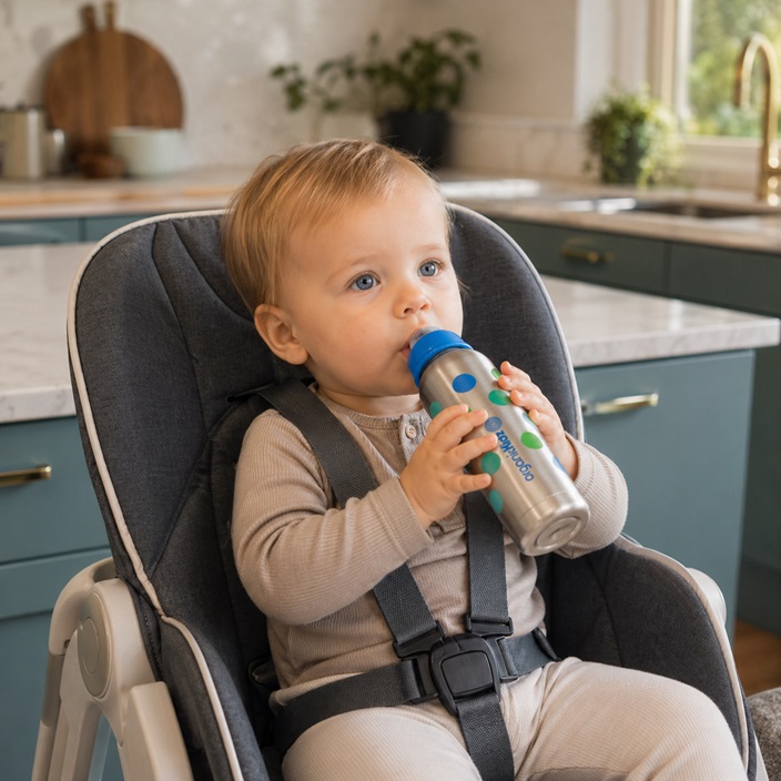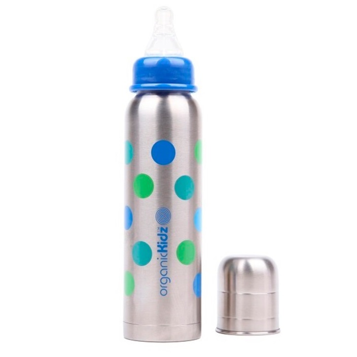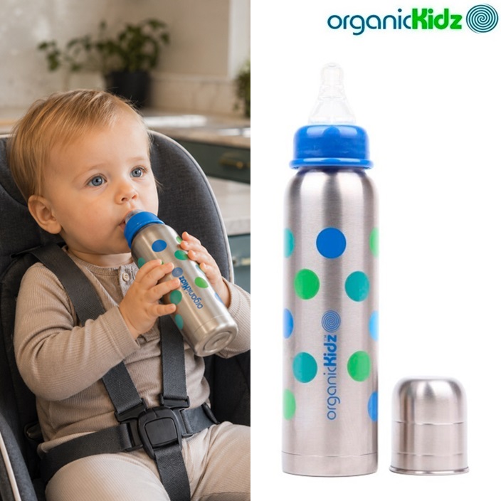Durable and practical thermal baby bottle (270 ml) in stainless steel with thermos function. OrganicKidz Thermal Baby Bottle Dots keeps the drink hot or cold for up to 6 hours. A thermo baby bottle is a functional and safe alternative to plastic and aluminum bottles. Free from PVC, bisphenol A and Phthalates. Smart and practical on the go, in town, when travelling or in nature.