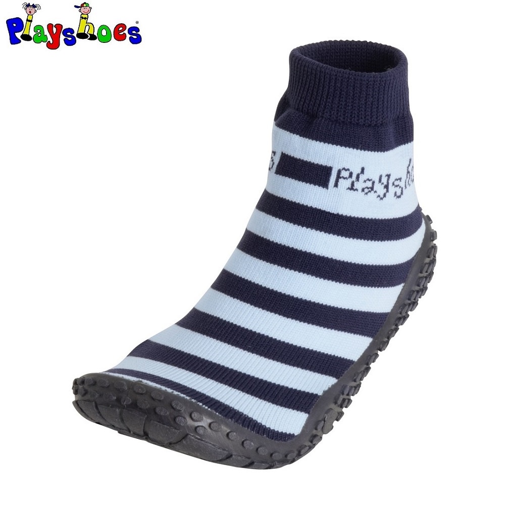 Playshoes Aquasocks Blue Stripes are comfortable and protective beach and waters socks for children for both beach and bathhouse. The beach socks have a sturdy TPR rubber sole that protects the child's foot from sharp rocks and from hot sand on the beach. In the bathhouse, the socks reduce the risk of your child slipping.