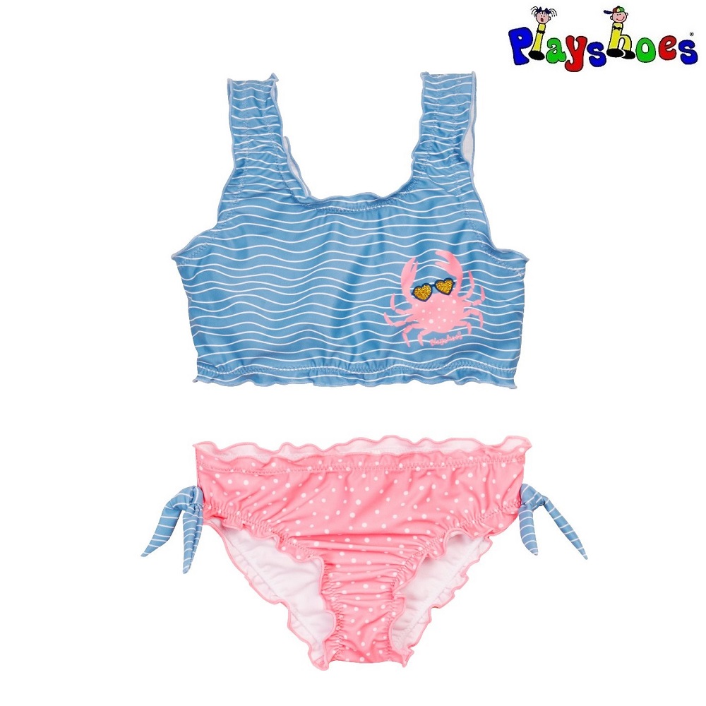 Cute and comfortable bikini (two-piece swimsuit) for children with UV protection (UPF 50+). Playshoes bikini Crab has a good fit with wide shoulder straps and elastic waistband. The bikini dries quickly and is made of Oeko-Tex approved (Standard 100) material. Playshoes bikini for children can be used just as well in the pool as in the sea.