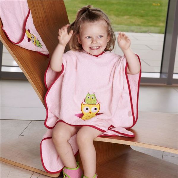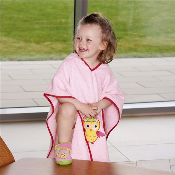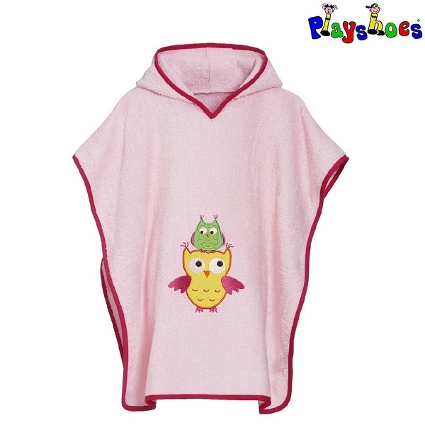 Plashoes Owl is a lovely and cozy hooded bath poncho for children. The poncho is made in a nice design for children to warm up in after the bath. Playshoes poncho is made of soft and warming terry and has a generous hood. A bath poncho is perfect after the bath on the holiday, on the home beach or after the bath in the bathtub.