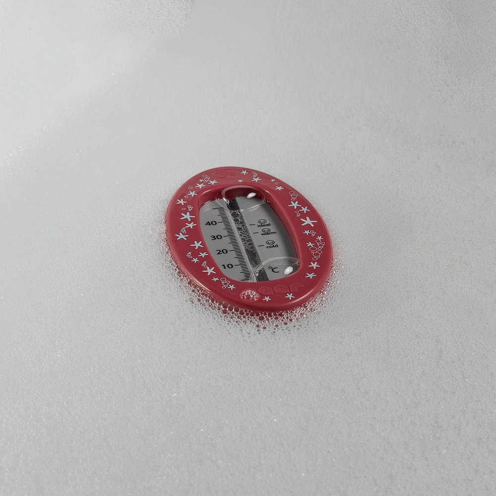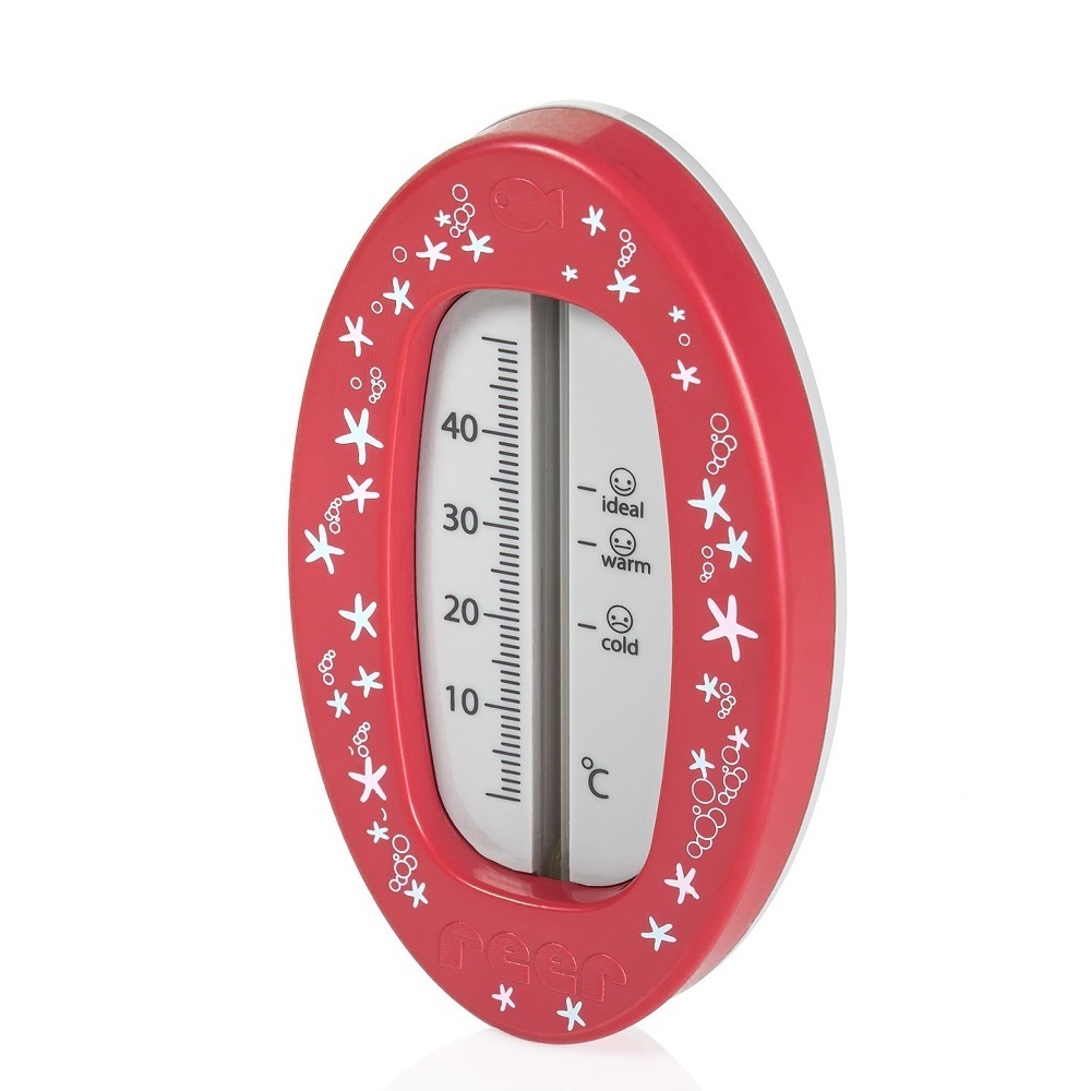 Reer Oval Pink is a functional and practical bath thermometer for bathing babies and children. The thermometer measures between 0 and 50 degrees and is clearly graded (with both numbers and emojis) for optimal bathing temperature for the child. The bath thermometer is made of durable material and has a non-toxic measuring liquid.