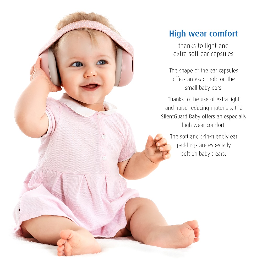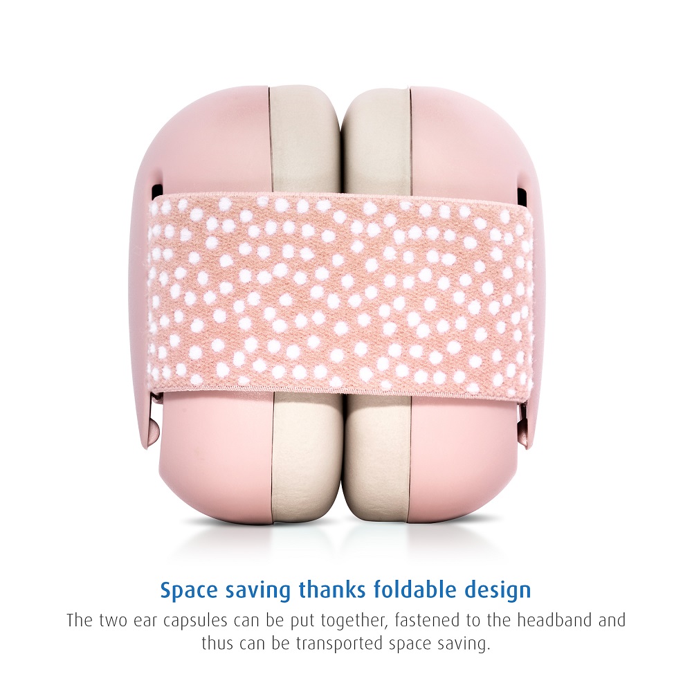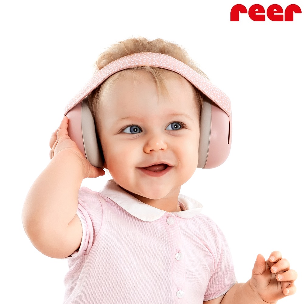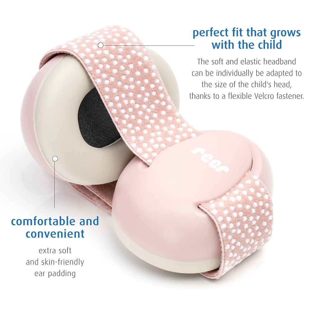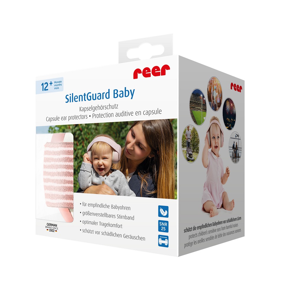 Reer SilentGuard Pink - ear defenders intended for babies and small children that are both comfortable and provide the child with a really good protection in noisy environments, such as on flights, at concerts or sporting events. Reer baby ear defenders have soft and skin-friendly sealing rings around the child's ears, textile upholstery and extra soft & adjustable elastic headband for the best fit and comfort for the baby's fragile head. The ear muffs are CE marked and have a certified attenuation rate of SNB 27 dB. The earmuffs can be folded and thus take really little space when not in use and are stored, for example, in hand luggage or in a backpack.