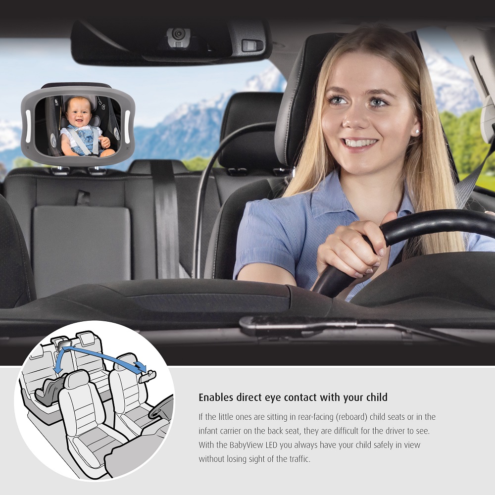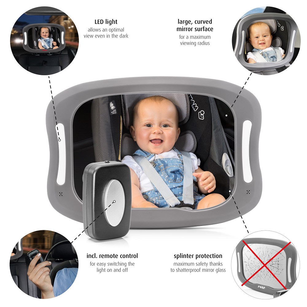 Reer BabyView is a smart car baby backseat mirror with built-in LED light (with remote control) for full supervision of your child in the rear seat both during the day and when it is dark in the car. Reer mirror has a large convex mirror that can be easily adjusted at the right angle to the child. The mirror is easily attached to the rear seat headrest and is adjustable both up and down and sideways. The mirror is made of unbreakable material and is intended to be used for rear-facing car seats.