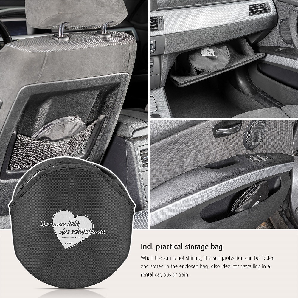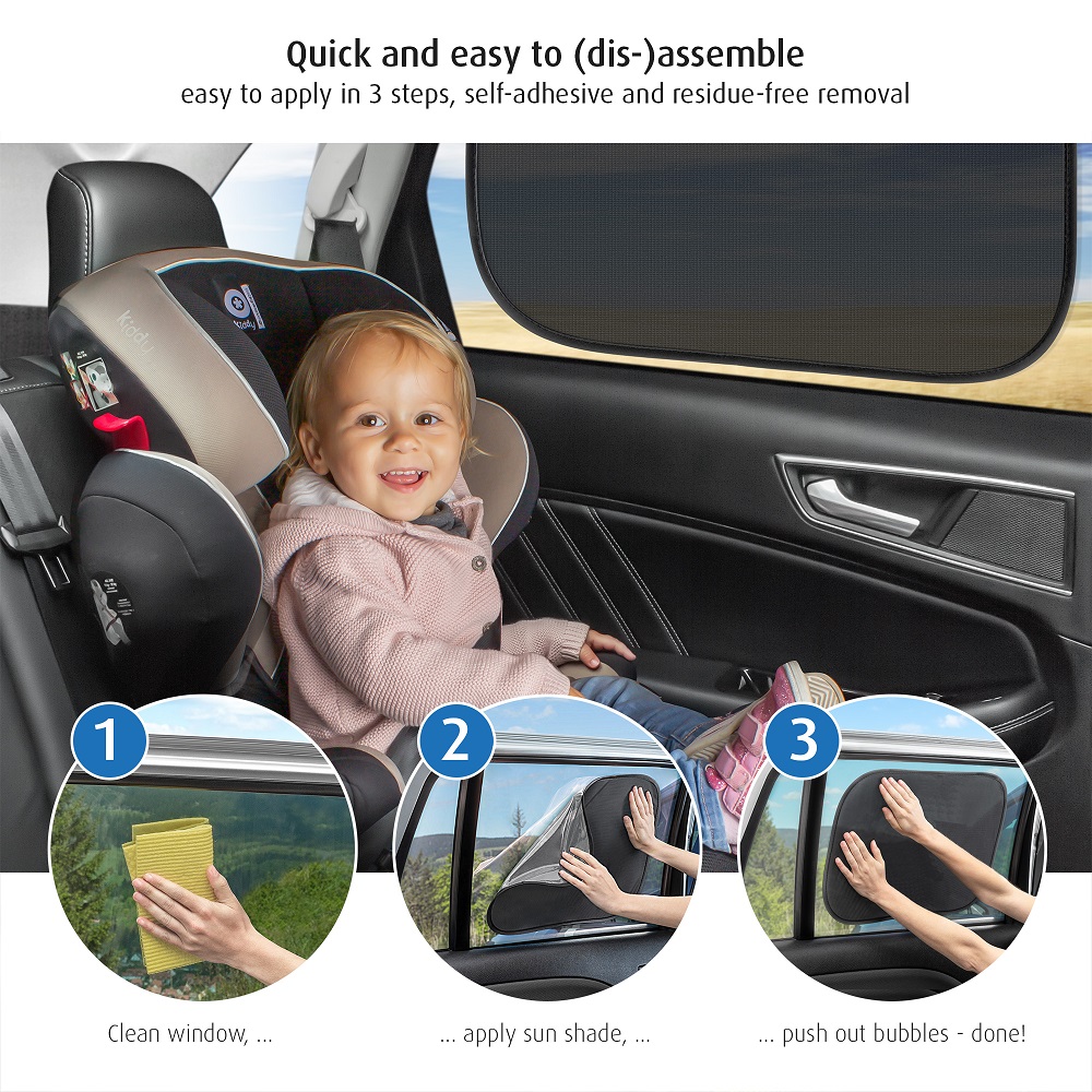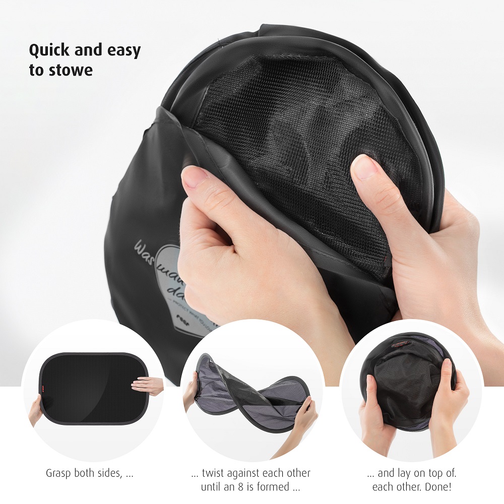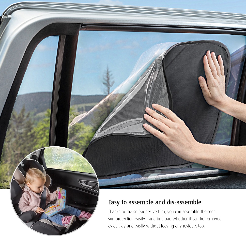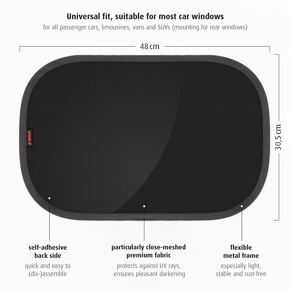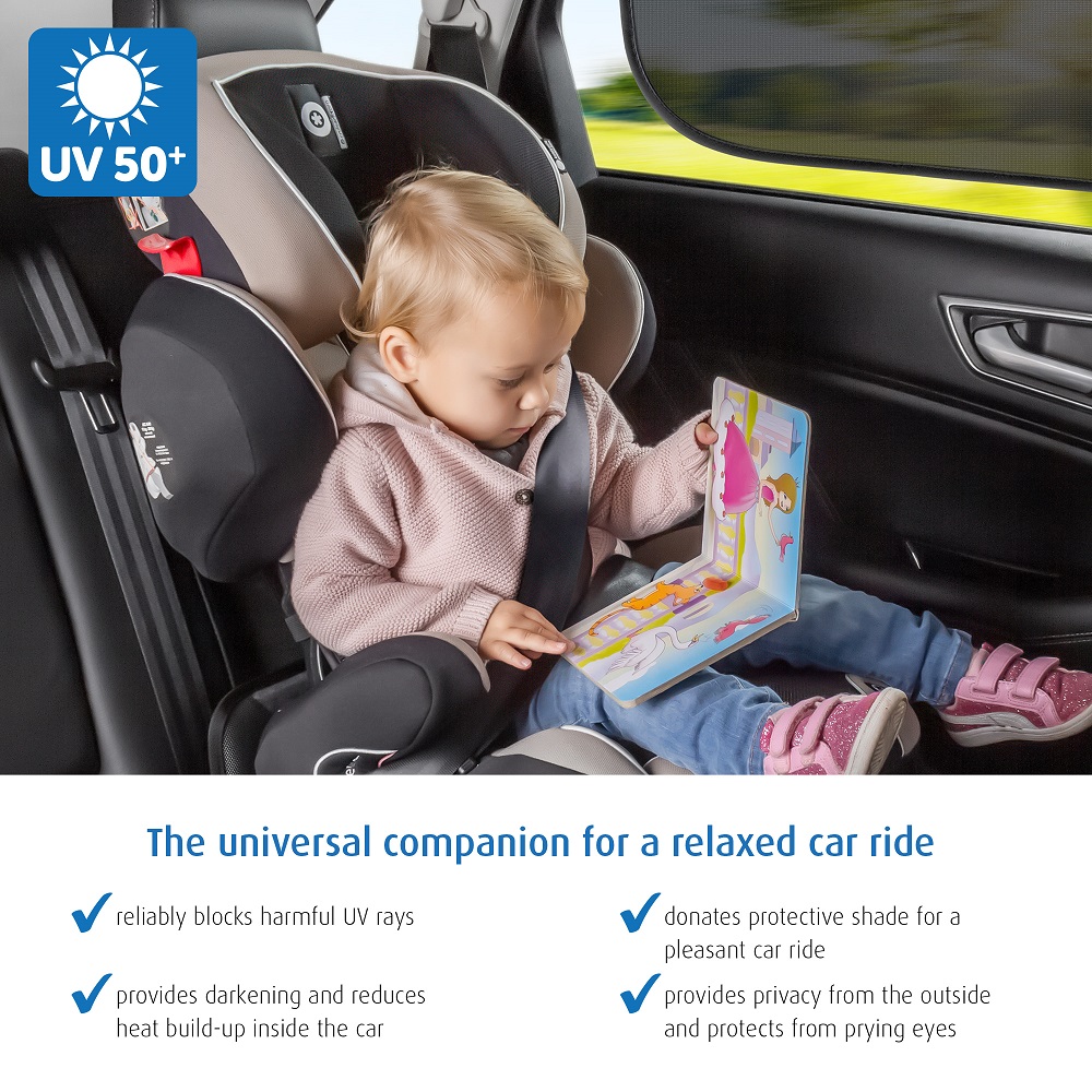 Reer TravelKid Black is a foldable and practical car sun shade (2-pack) for the car's rear side windows. The sun shade is self-attaching (without suction plugs) and made in pop-up technology, which makes it easy to set it up and take it down. Reer World Car Sun Shade is quite large (51 x 34 cm) and protects against the sun's rays while maintaining good vision for the driver. The sun shade is universal and fits most car models.