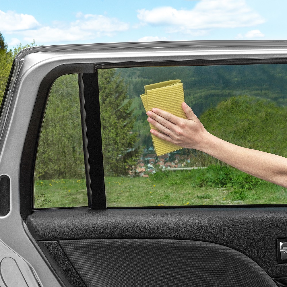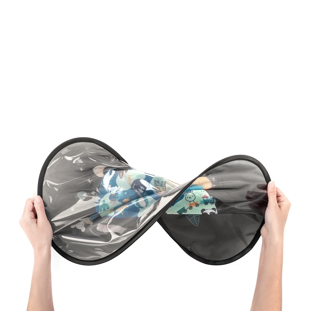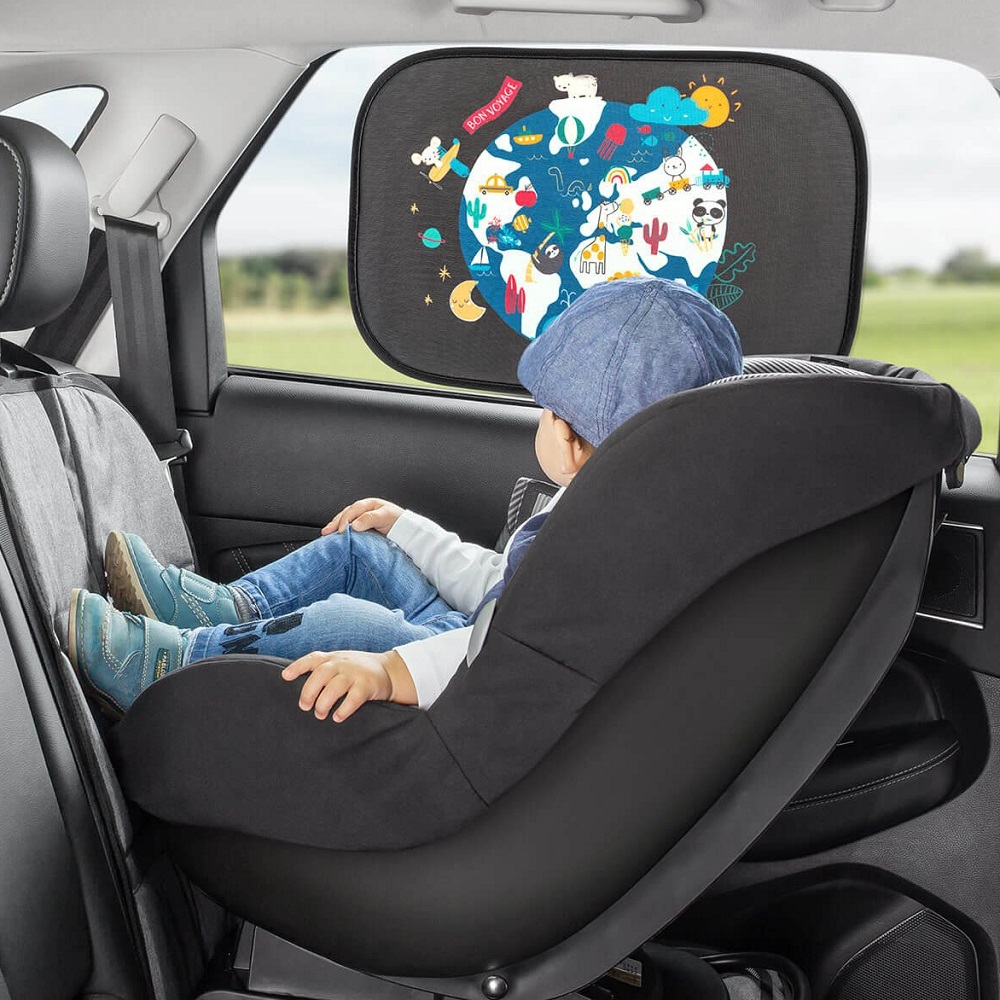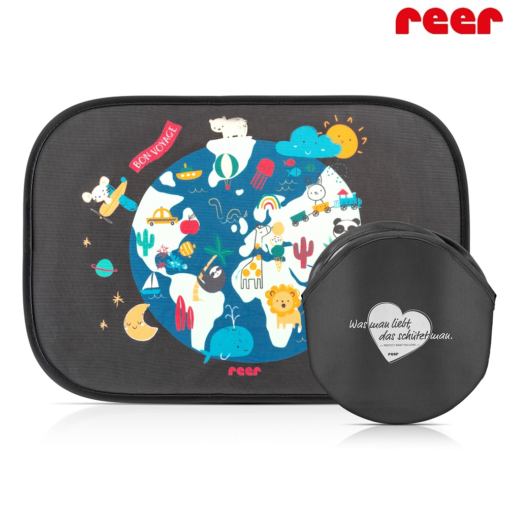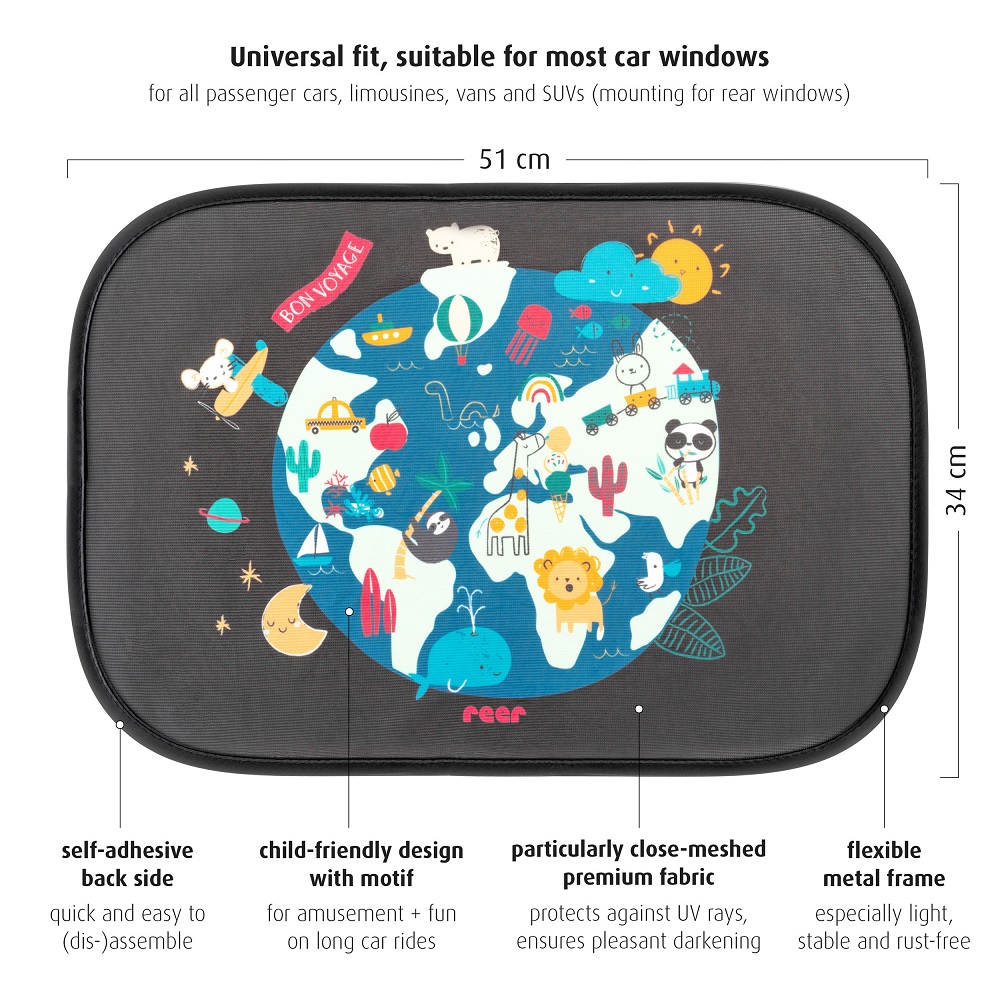 Reer TravelKid World is a foldable and practical car sun shade (2-pack) for the car's rear side windows. The sun shade is self-attaching (without suction plugs) and made in pop-up technology, which makes it easy to set it up and take it down. Reer World Car Sun Shade is quite large (51 x 34 cm) and protects against the sun's rays while maintaining good vision for the driver. The sun shade is universal and fits most car models.