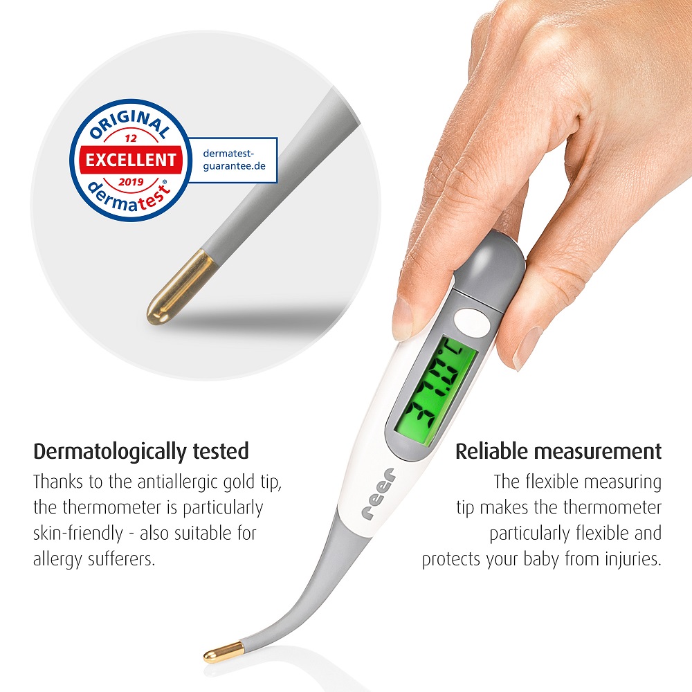 The Reer ExpressTemp Pro is a fast-measuring digital fever thermometer that works just as well for children as it does for adults. The fever thermometer has a dermatologically tested top, which is both gentle on the baby's sensitive skin and allergy-proof. In addition, the top is bendable. The fever thermometer measures the temperature in about 10 seconds and is shown on a clear LCD display. When the thermometer is started, the result of the previous temperature measurement is displayed. Reer ExpressTemp Pro is waterproof and comes in a practical storage case.