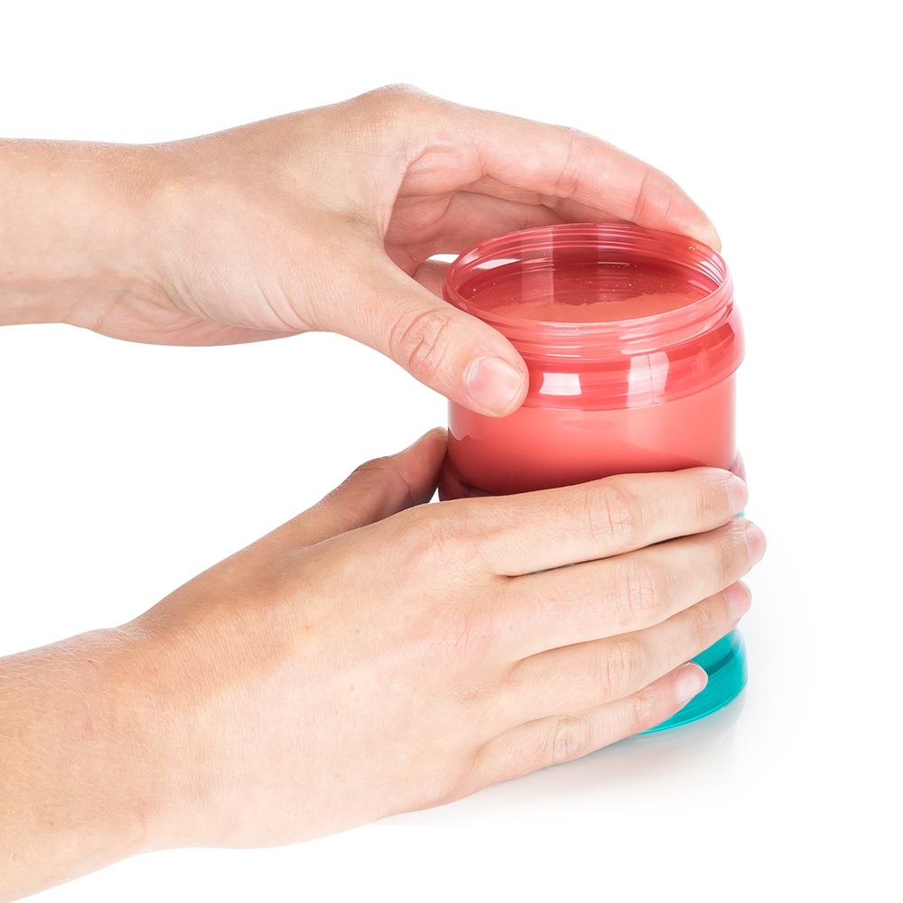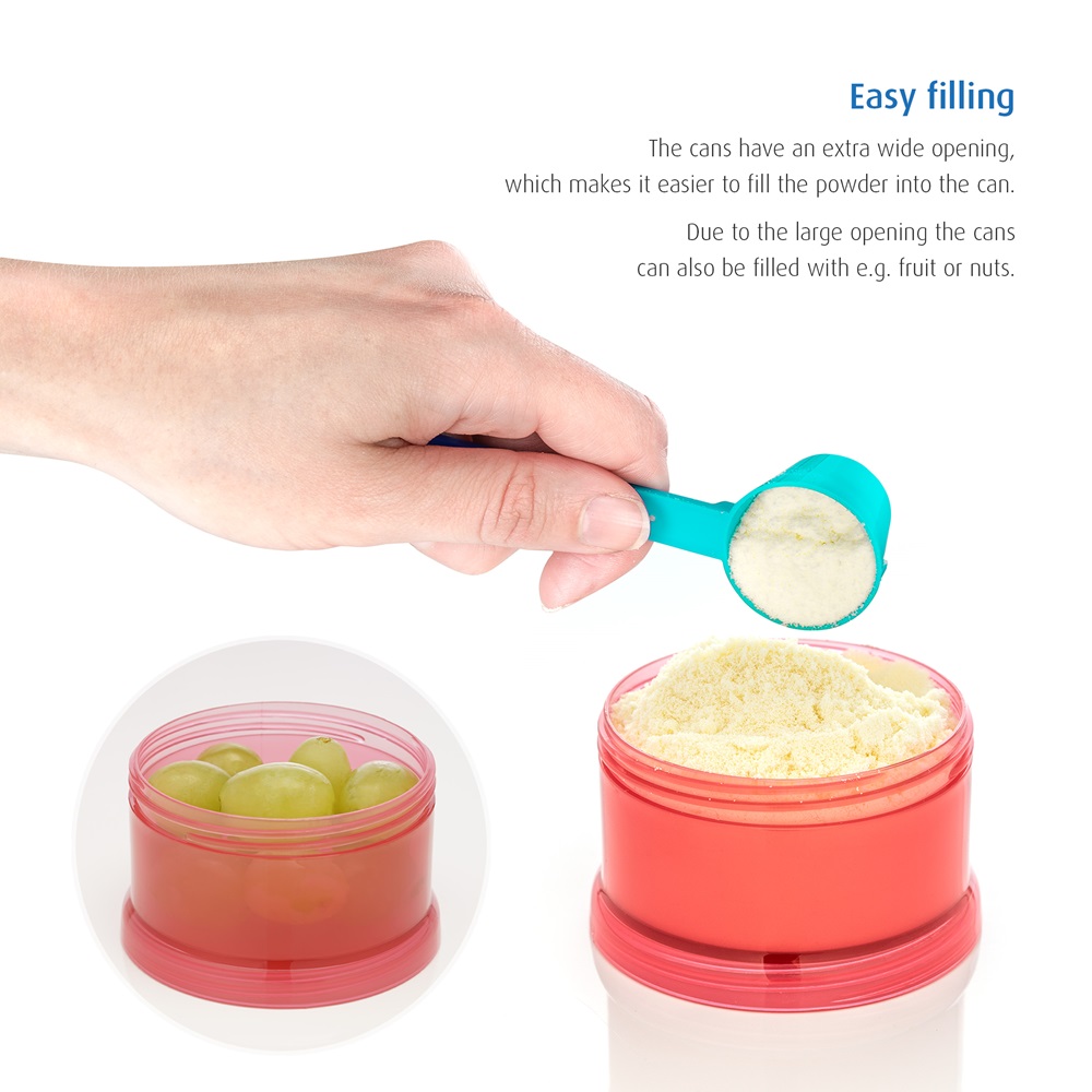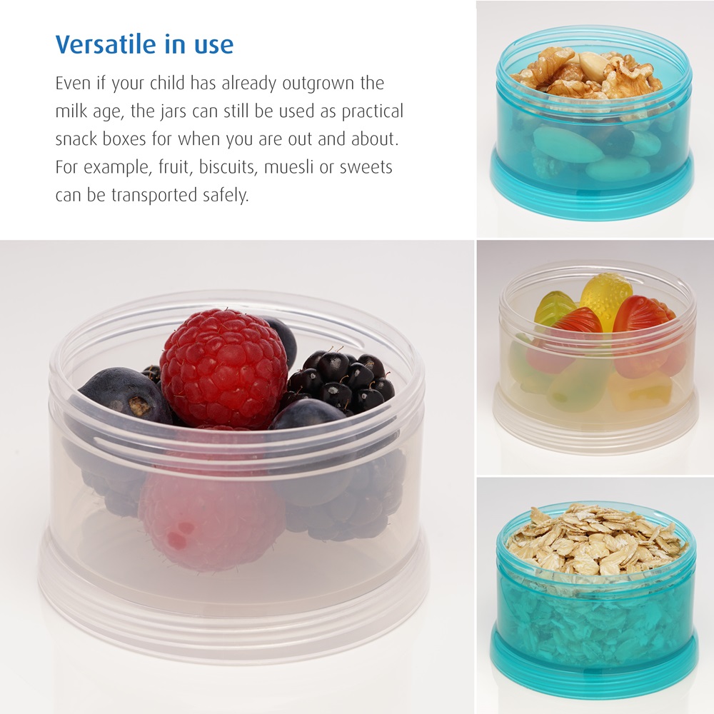Reer Milk Powder dispenser is a smart set of jars for milk powder and infant formula. The three containers, which each hold about 60 grams, can be screwed on top of each other. The containers can also be used one by one. The top container is closed with a practical funnel with a lid. The funnel is used to more easily fill the baby bottle with the milk powder. Reer Milk Powder Dispenser is perfect to take with you on the trip or when you are away from home.