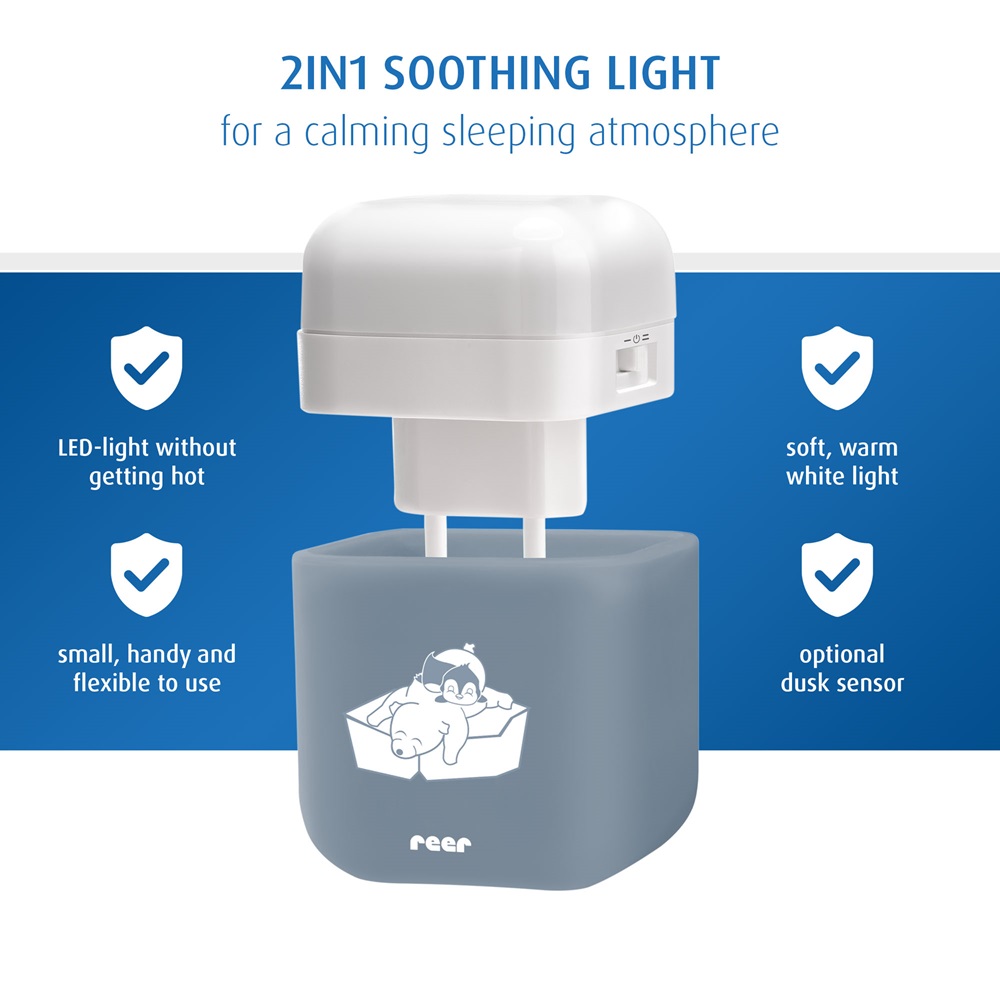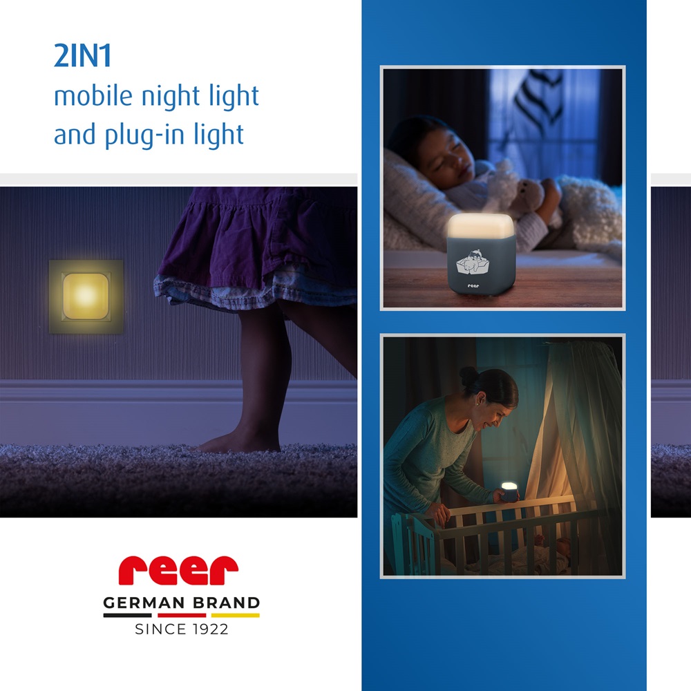 Reer Blue Cube 2in1 SleepLight is a cute and practical night light for children that can be used both in a regular wall socket and freestanding, for example on the bedside table. The night light illuminates with a soft white light and can be set on two different brightness levels. The night lamp also has a light sensor, which means that it automatically goes out when it gets light and comes on again when it gets dark in the evening. Reer night light 2 in 1 SleepLight has rechargeable batteries (charges when used in electrical outlets) and is made with energy-saving LED technology which also means that the lamp does not get overheated. The night light can be used both daily in the child's room or taken along to the weekend trip, as it is small and handy to take along.