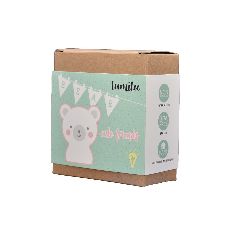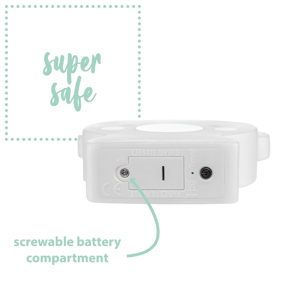 Reer Cute Friends Bear is a lovely battery-powered night light for children that illuminates with soft brightness. The night light is made with LED technology and therefore has a long lifetime of about 50,000 hours (battery replacement is needed) and emits no heat. The batteries are securely hidden inside the lamp behind a lid that is closed with a screw, so that the child cannot access them. The night light has a timer function (15 minutes) and is free of BPA and Phthalates.