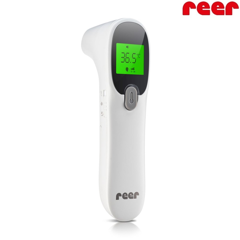 Reer Coulour SkinTemp 3-in-1 is a fast-measuring (approx. 1 second) contactless infared digital thermometer that works just like a fever thermometer as for measuring the surface temperature of food, air or bath water. The thermometer has a clear and illuminated (good for night use) display that changes color from green to red depending on the measured body temperature. Baby mode can be switched on, the temperature then is measured according to small children´s values, not adults. When fever is detected, a warning sound is emitted. Easy to use and hygenic way to measure the babyś temperature also at night. Reer Colour SkinTemp is battery-powered (batteries included). The thermometer remembers the last 25 measurements.