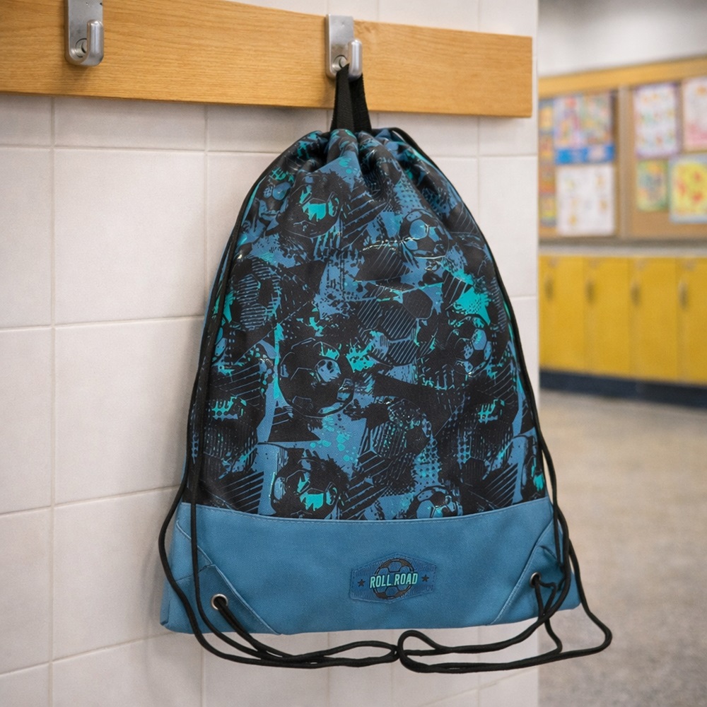 The Roll Road Football drawstring bag combines style, functionality and durability, making it a perfect choice for kids. Ideal for gym class, sports practice, beach trips or as a handy travel pouch, this bag quickly becomes a favourite both at home and on the go. The bag features a simple yet smart design with a top drawstring closure that is easy for children to use. The drawstrings also double as comfortable shoulder straps, allowing the bag to be worn like a small backpack for full freedom and comfort throughout the day. Designed for practicality and long-lasting use, the bag includes a top loop for carrying or hanging when not in use. Its reinforced bottom is made from water-resistant material, protecting contents and increasing durability — perfect for sports, play and everyday adventures.