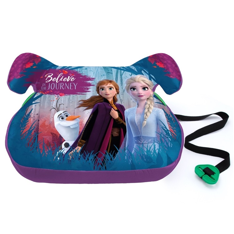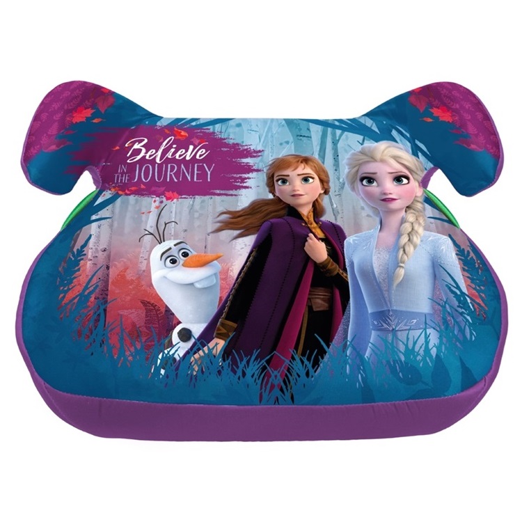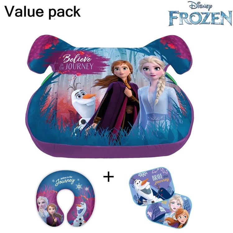 Frozen II car travel set for kids consisting of a booster seat, neck pillow and car sun shades. The car booster seat is a practical and superlight seat with seat belt positioning for children between 125 and 150 cm tall. The booster seat, which must be used facing forward, is ergonomically designed, universal and fits in all cars with a three-point seat belt. The booster seat can be used in all places in the car (front and back). The Frozen booster seat has a seat belt positioning so that the seat belt comes at the right height over the child's chest and not, for example, over the neck. The booster seat takes up little space, which makes it easy to carry and use, for example, in the rental car, the bus or when your child is going with grandma and grandpa or in a friend's car. The cover for the booster seat is removable and can be washed. Supersoft neckpillow is filled with microbeads and moulds perfectly around the child´s neck and head, provoding ultiamte comfort during lengthy car rides. Underneath the pillow is soft and pleasant fleece-fabric. The car ś pop-up sunshades are easy to place, the shades are placed on teh car side window with a suction cup. This is a priceworthy combo of three car essentials for kids - that make car travel with kids safe and easy!